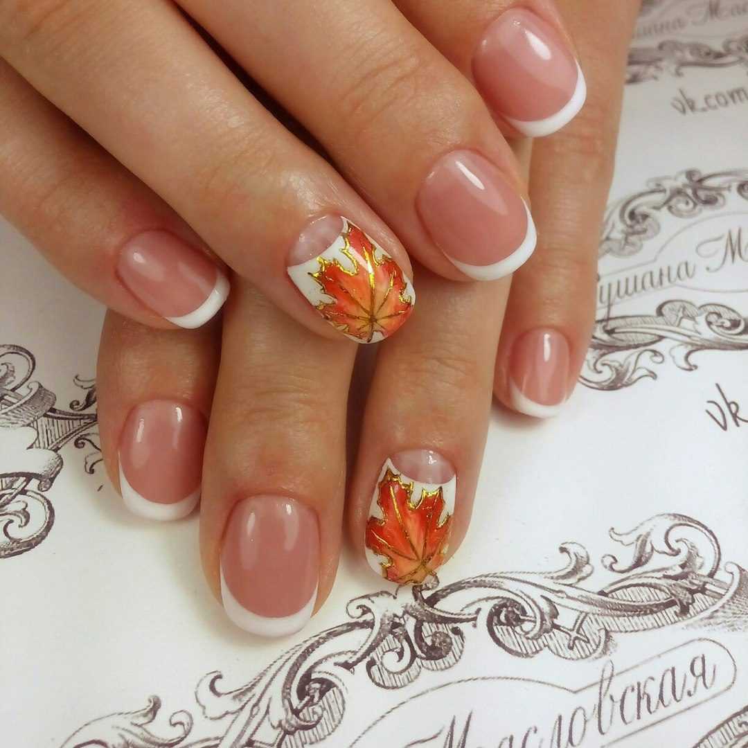 Необычный френч — признак тонкого вкуса. Вы можете выбрать прозрачную, молочную или бежевую базу. А кончик ногтя выделить абрикосовым или апельсиновым. Основной фон можно дополнить нежными узорами — черным, золотым или белым.