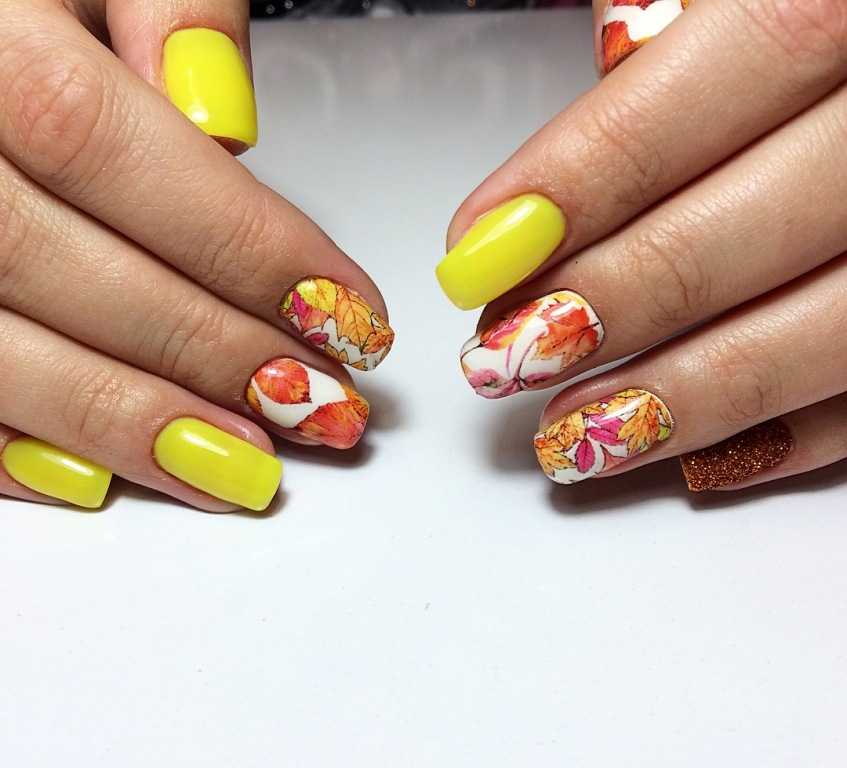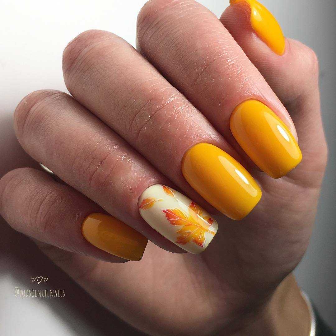 Эта техника маникюра выглядит освежающе и действительно по летнему. Желтые, оранжевые оттенки лаков на пике популярности в нейл-арте в 2020-2021 году.