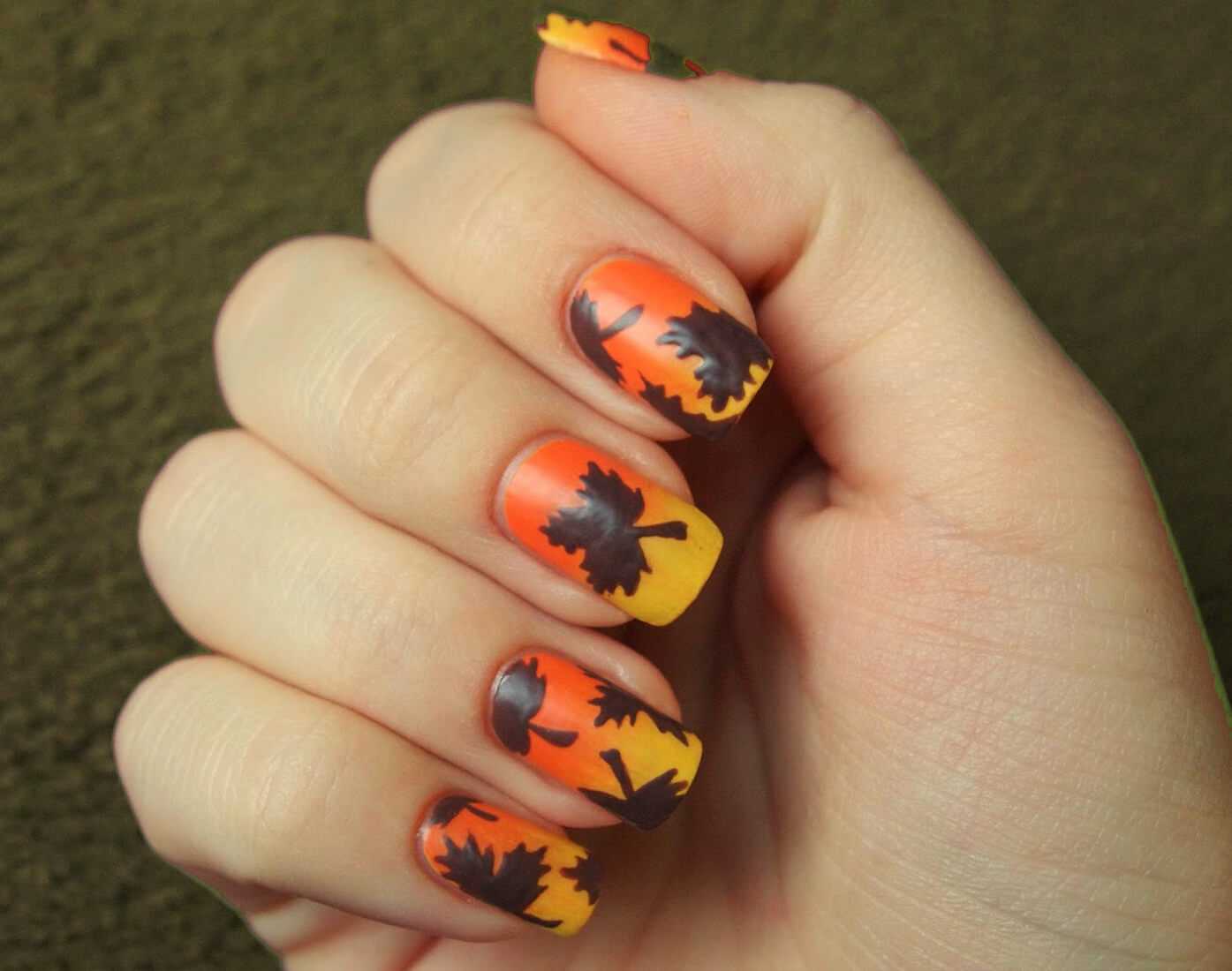 Темные оттенки оранжевого великолепно смотрятся в нейл-артах на осеннюю тему. Сама природа подсказывает нам идеи для оригинальных дизайнов, нам остается только перенести на поверхность ногтей глубокие оттенки оранжевого с традиционными тематическими рисунками.