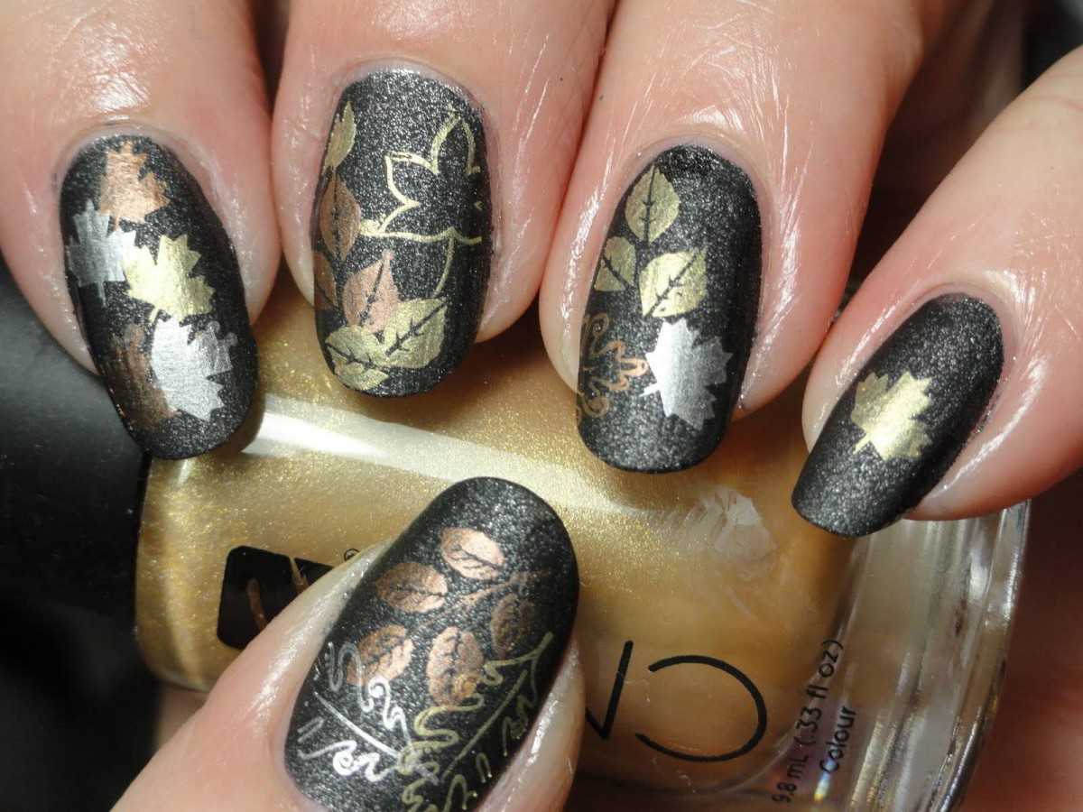 Черный маникюр с листьями