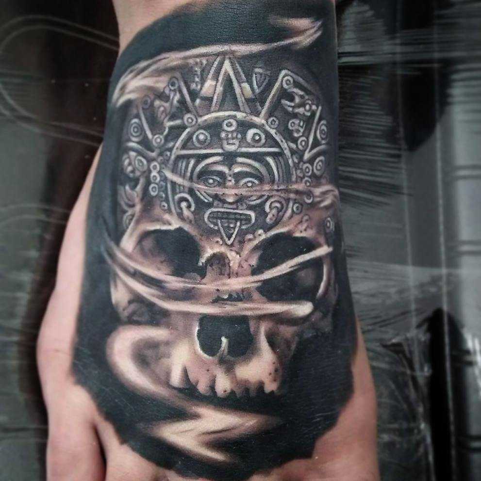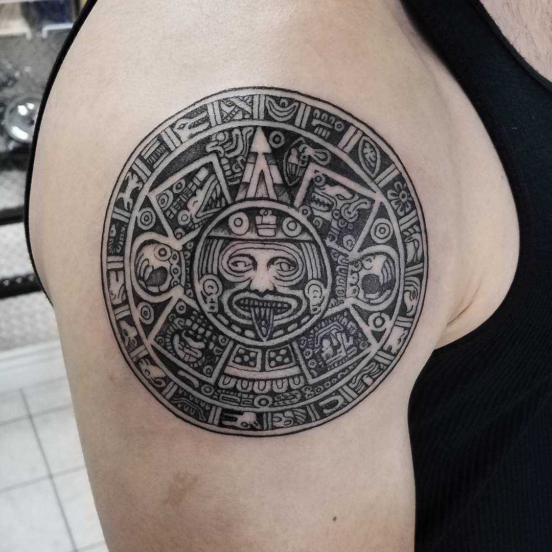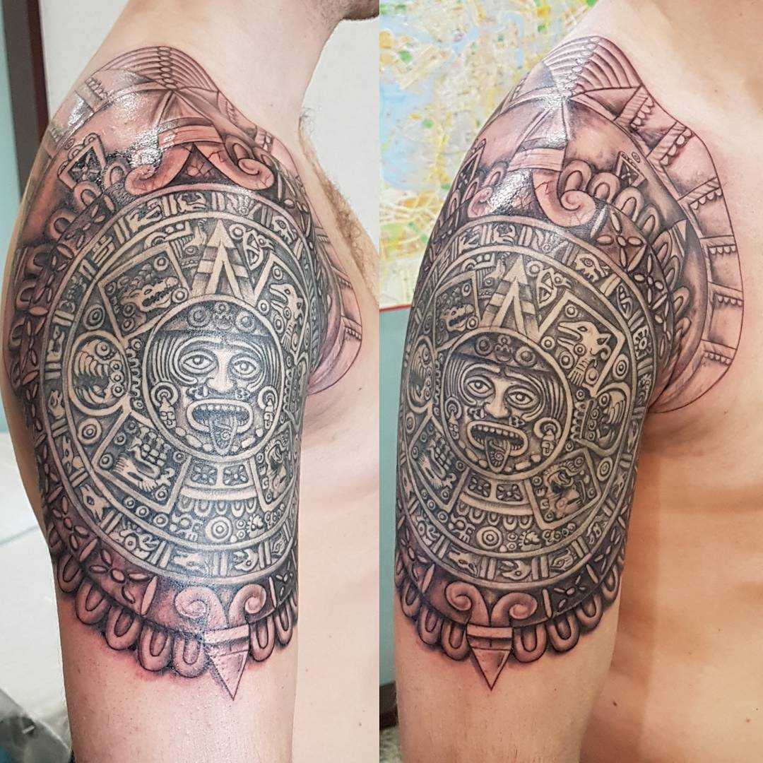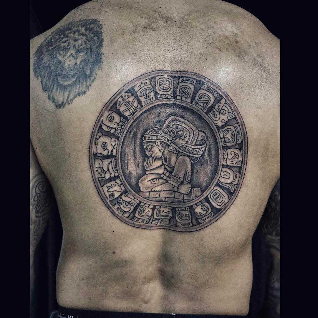 Татуировки, выполненные в стиле майя на данный момент пользуются большим спросом. Свое предпочтение таким тату отдают те люди, которые испытывают интерес к традициям и обычаям древних племен Майя. Такое тату несет в себе очень глубокий и сильный смысл. Для выполнения рисунка используется шрифт со множеством тонких линий. Если капнуть историю племен Майя, то можно узнать, что их главарем племени был Бог Акат, который отвечал за росписи тел. Считалось, что татуировка для индейцев была частью их жизни. Убив какого-либо крупного животного, индейцу наносили татуировку в виде волка или медведя. Это и объясняет тот факт, что у большинства представителей племени Майя все тело расписано татуировками.