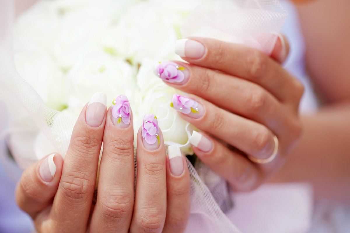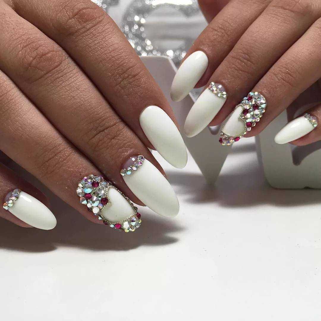 Невесты часто отдают предпочтение именно длинным ногтям, наращивая дополнительную длину для создания сложных дизайнов. Свадебный нейл-арт чаще всего выполняется в стиле френч с крупными стразами и лепниной. Не обходится без цветов, геометрических принтов и ажурных узоров, повторяющих рисунок на фате.