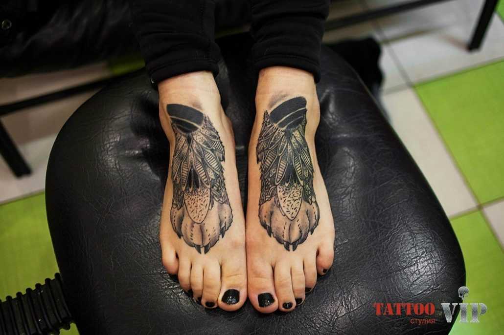 Тату в районе стопы лучше делать в теплое время года, когда можно носить максимально открытую обувь, которая не будет травмировать заживающую рану.
