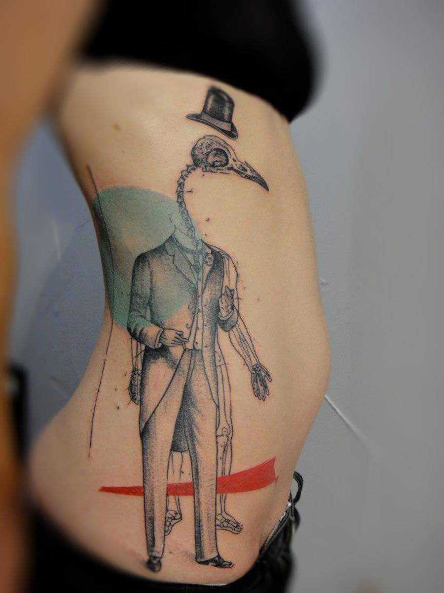 Кроме идей, которые были массово поддержаны фэшн-обществом, есть альтернативные варианты. Они также пользуются популярностью, но в значительно меньшем объеме. Так, например, многие девушки выбрали для себя красочные татуировки на боку. Обычно это крупные рисунки, выполненные тушью различных цветов. Чаще всего такие модницы выбирают цветочный орнамент или сюжетные картины.