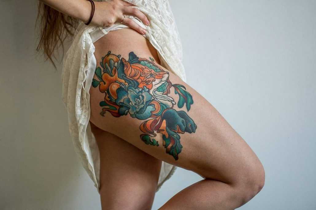 Идеальной зоной для нанесения эротического изображения станет бедро. Такие татуировки прекрасно выглядят на фоне кружевного белья и при необходимости могут быть спрятаны под одеждой. Рисунок на бедре может быть обособленным или составлять часть композиции с татуировкой внизу живота.