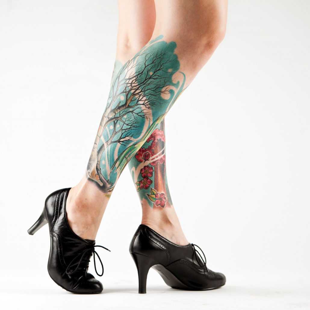 Нанесение татуировки на голень является достаточно болезненным, так здесь мало мягких тканей. Выполнение тату на икре является менее болезненным. Щадящим можно назвать вариант, где узор проходит от щиколотки вверх по икре или обвивает голень.