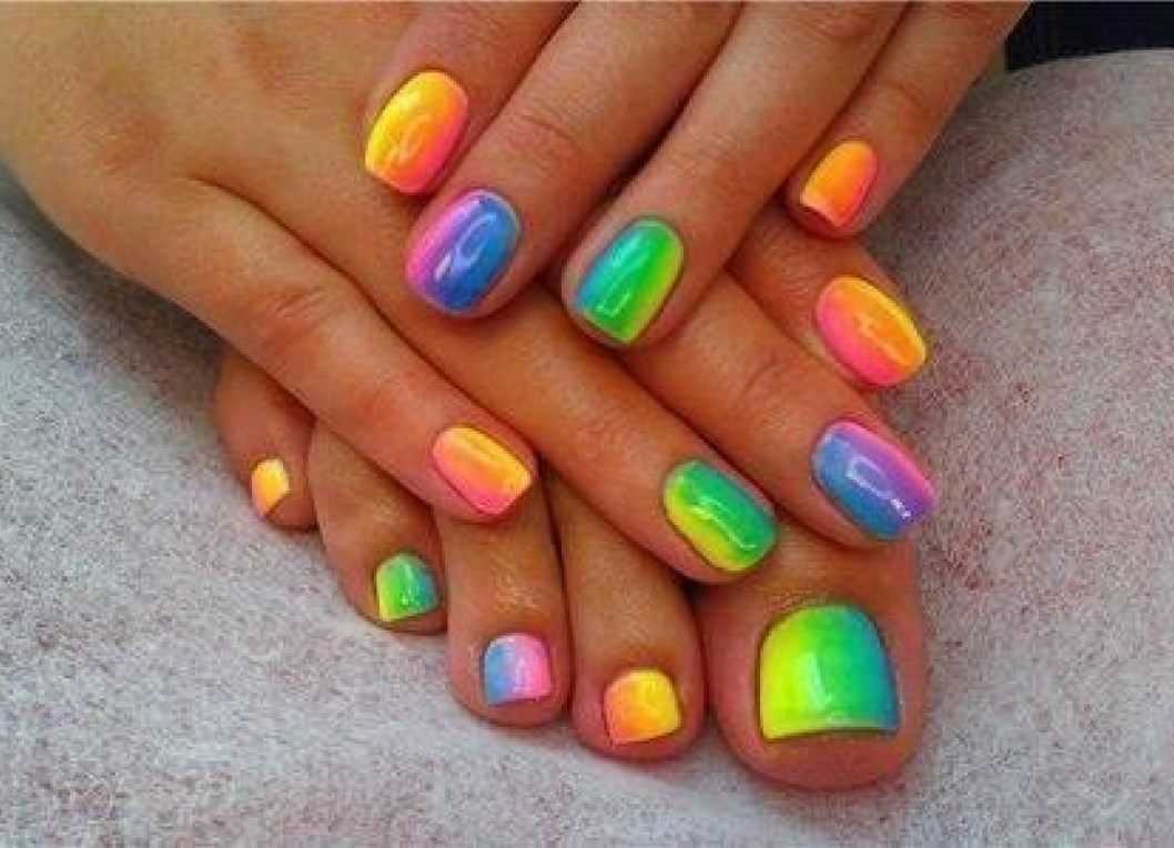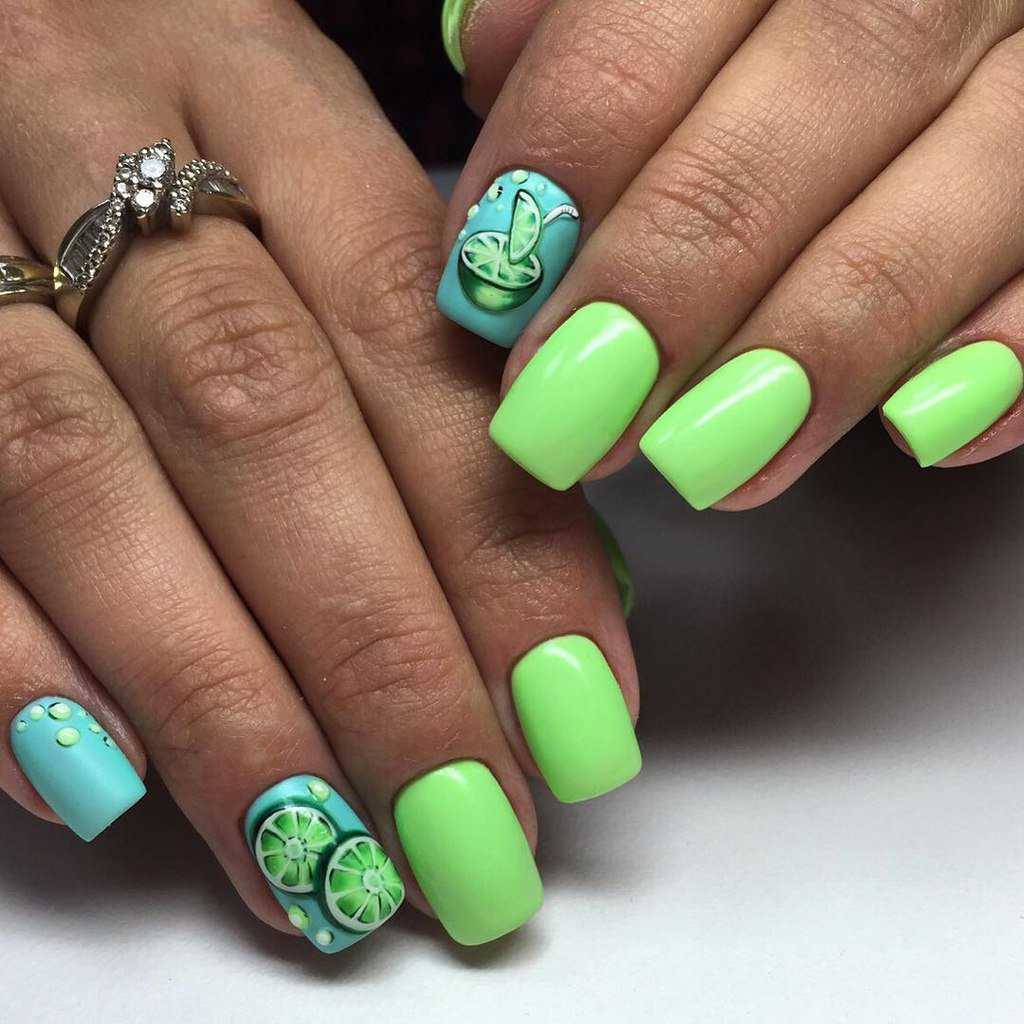 Для создания подобного маникюра обычно используется несколько оттенков лака. Каждый ноготок можно покрыть разными лаками и украсить 1-2 акцентных пальца тематическими летними артами.