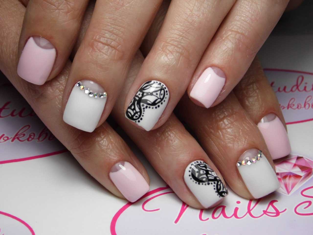 Маникюрное кружево подойдет для многих ситуаций. Желательна фиксация прозрачным лаком. Модный маникюр проявит устойчивость при использовании надежного финишного лакового покрытия.