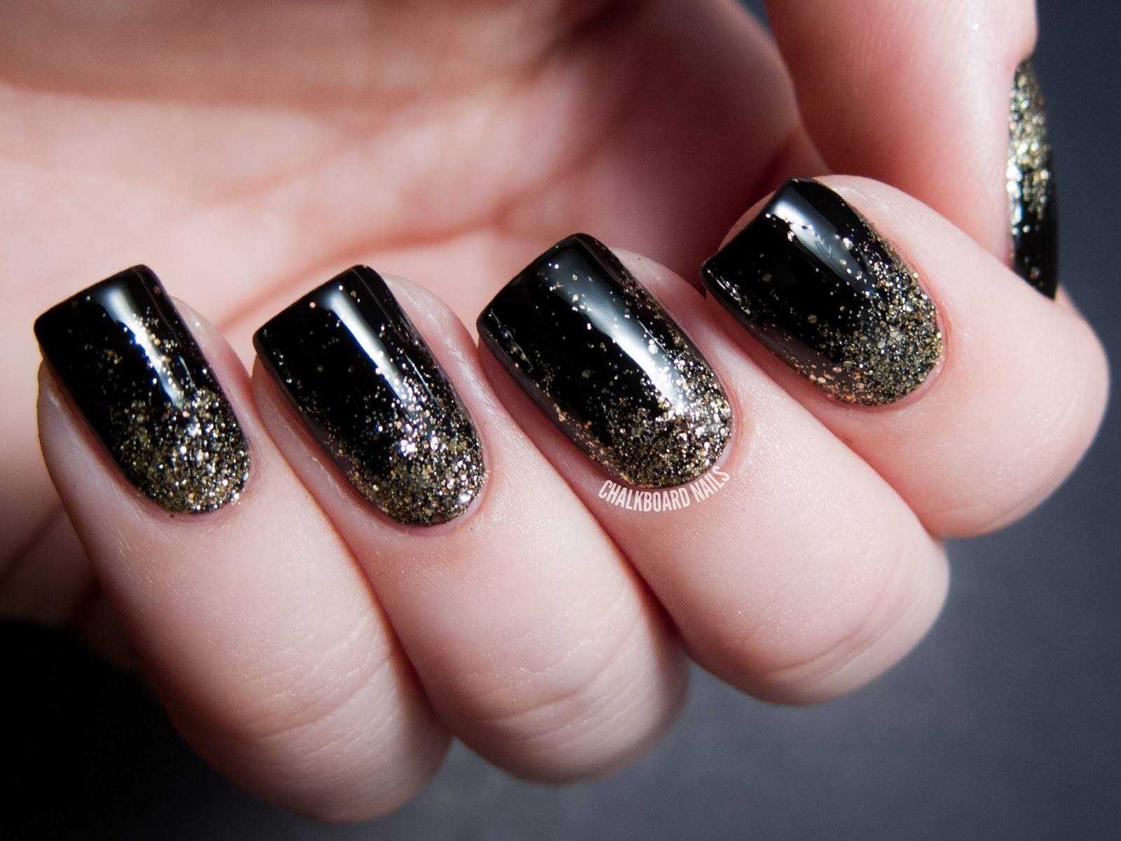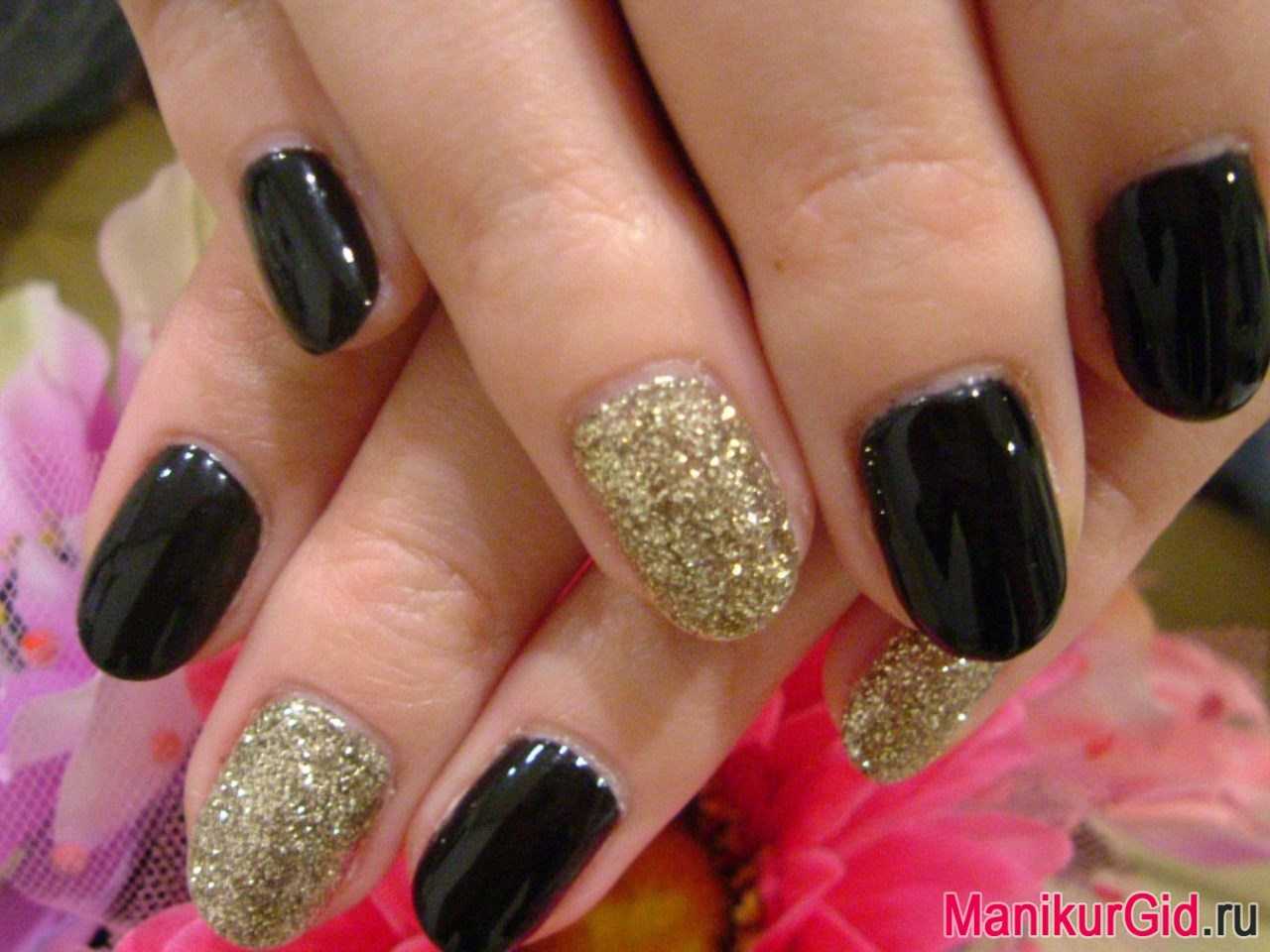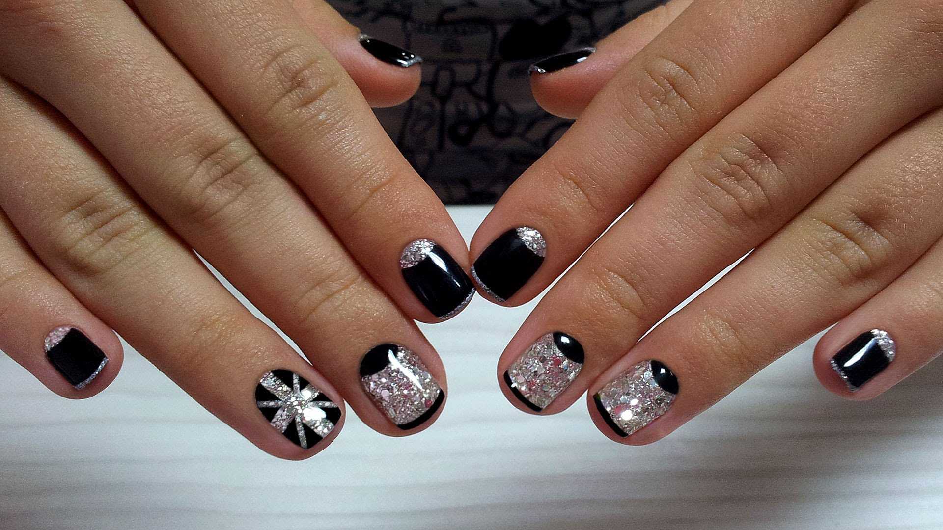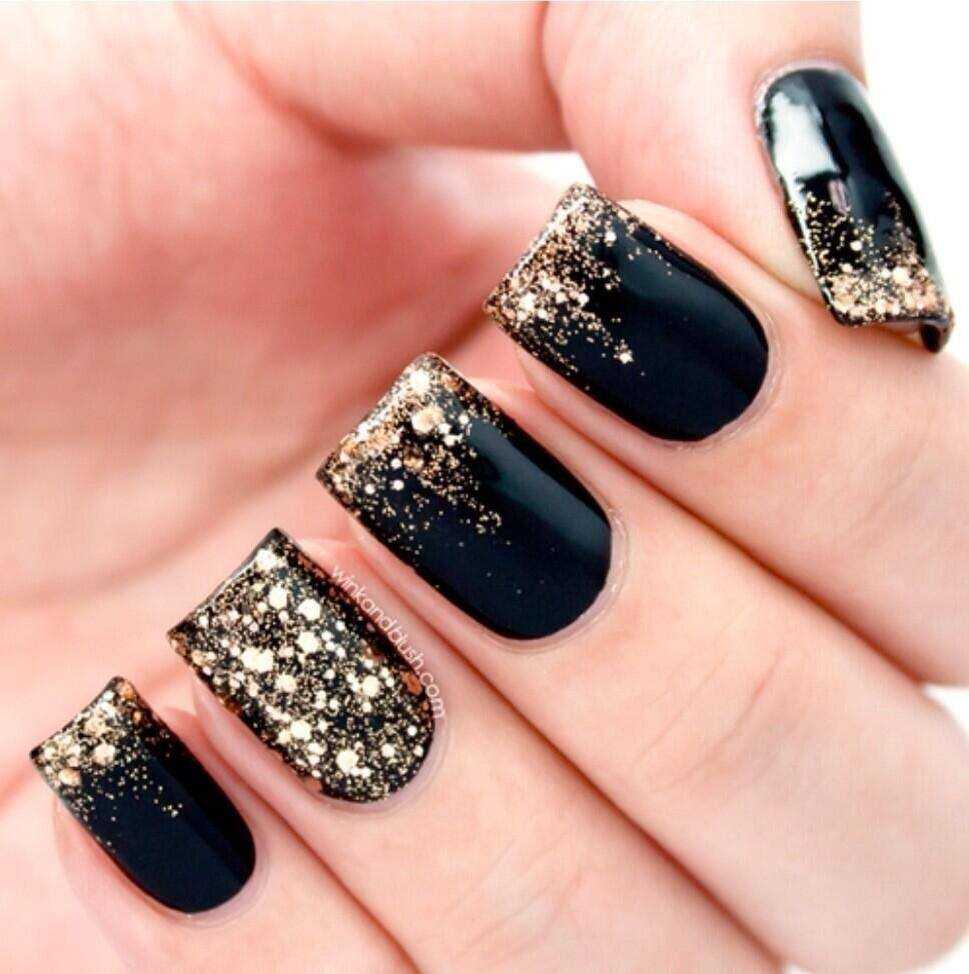 Блестки прекрасно сглаживают мрачность черных ногтей и акцентируют внимание на элементах дизайна. В качестве графического орнамента можно использовать хаотичные линии, геометрические формы, рассеянные узоры