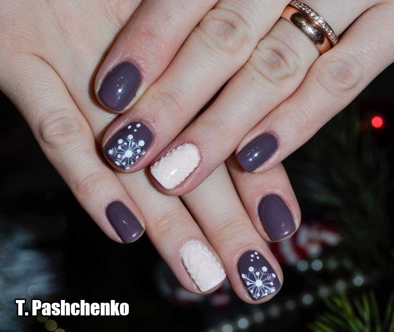 Ахроматические цвета лакового покрытия для вязаного маникюра – это белый, серый и черный. Они не имеют цветности, а лишь обладают светлотой, которая способна отражать или поглощать световые лучи. Цвет маникюра наряду с фактурой и дизайном является основным элементом зрительного восприятия. Белоснежный вязаный дизайн ногтевой пластины прекрасно вписывается в зимнюю пору. Вязаные узоры на ногтях, имитирующих узор с петлями-стежками, в белом исполнении – очень актуален среди женщин.