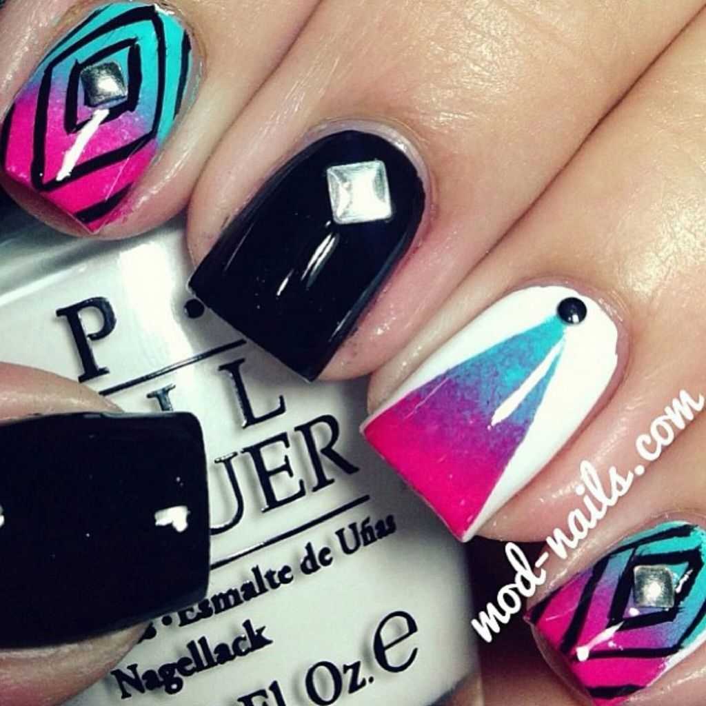 Микс с использованием черного цвета в основном используется барышнями, стремящимися показать свою индивидуальность и оригинальность. Мастер нейл-дизайна может оформить их ноготки с применением различных рисунков – растительность, геометрические фигуры, геральдика или создать на каждом пальце отдельную композицию, которая будет схожа с общей стилистикой дизайна.