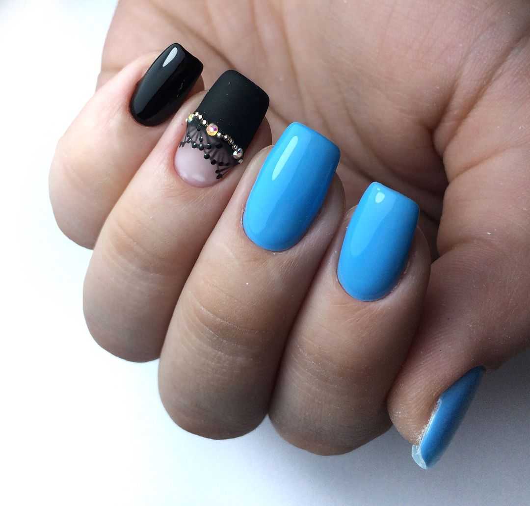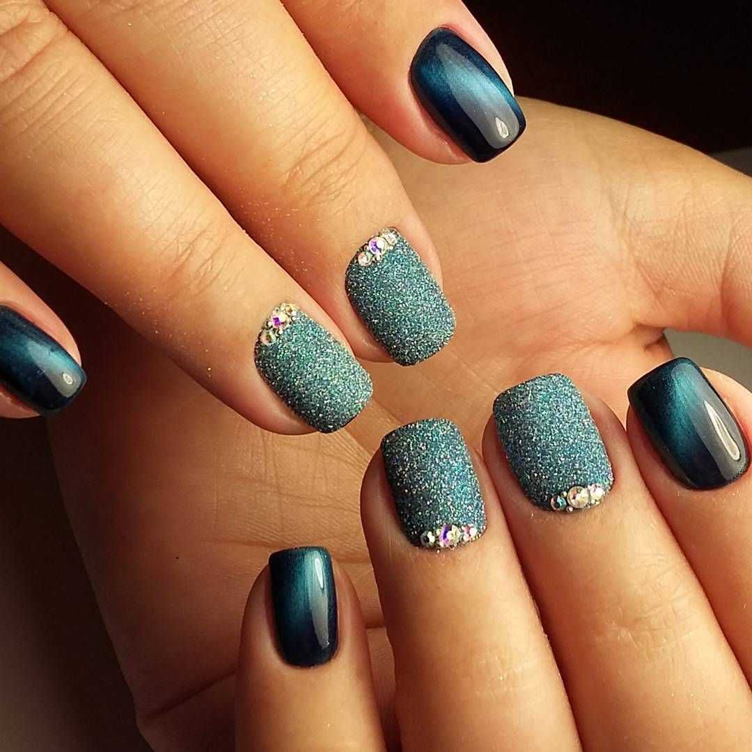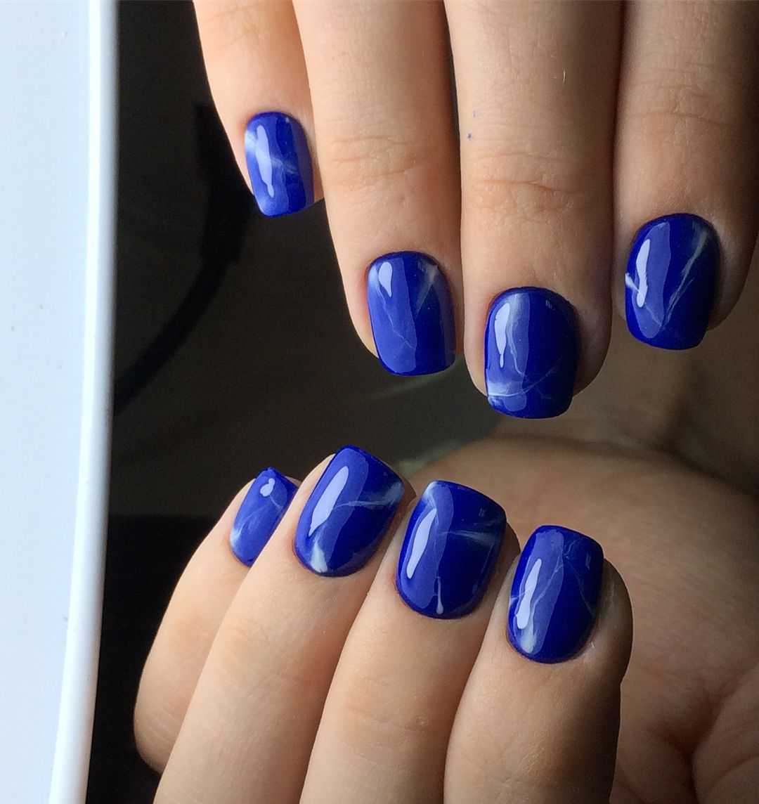 Нейл-дизайнеры предлагаю поиграть и с текстурами. Ведь маникюр с синим лаком эффектно смотрится и в глянцевом, и в матовом покрытиях. Если хочешь получить более контрастный эффект, сочетай глянцевый и матовый между собой.