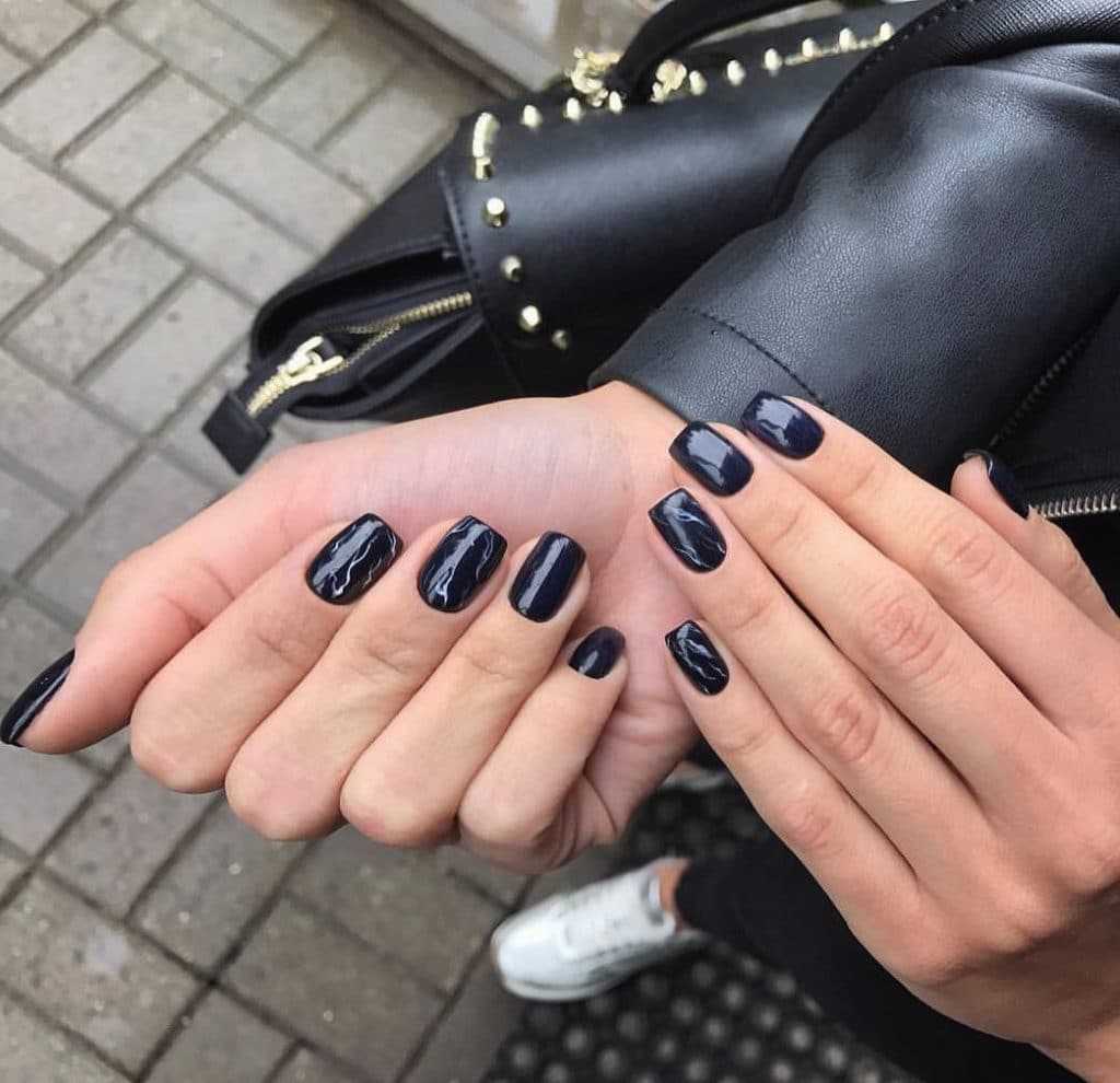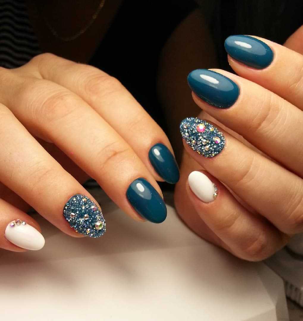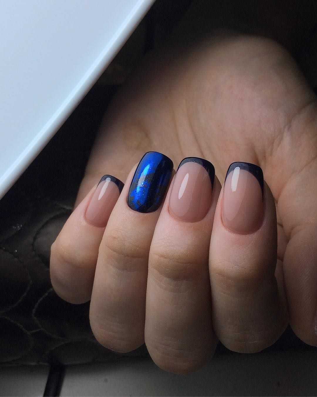 Нейл-дизайнеры предлагаю поиграть и с текстурами. Ведь маникюр с синим лаком эффектно смотрится и в глянцевом, и в матовом покрытиях. Если хочешь получить более контрастный эффект, сочетай глянцевый и матовый между собой.