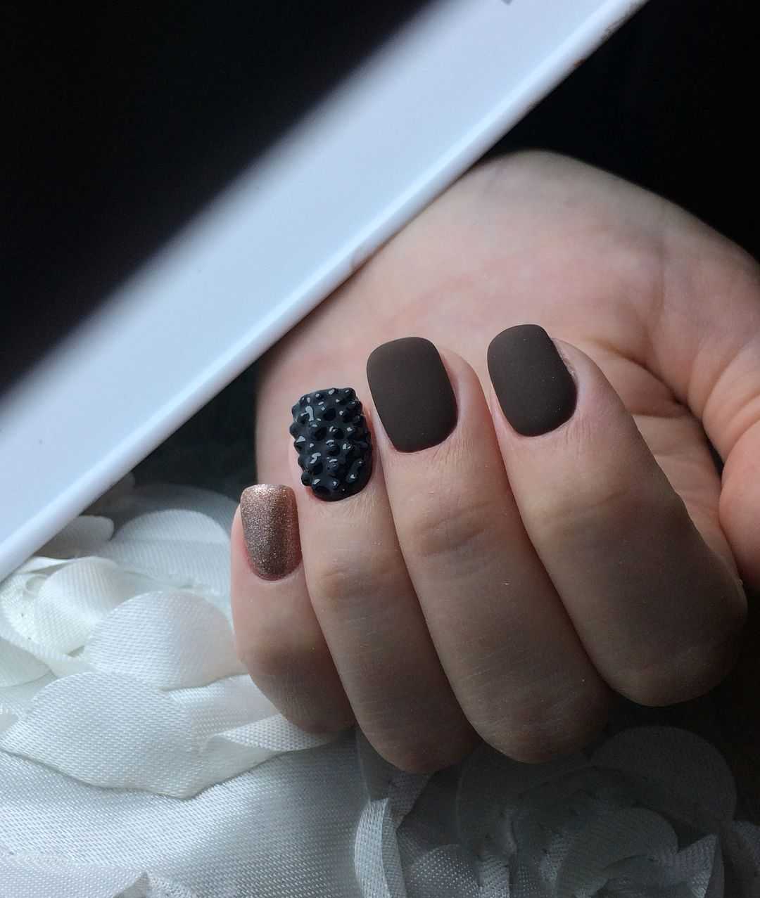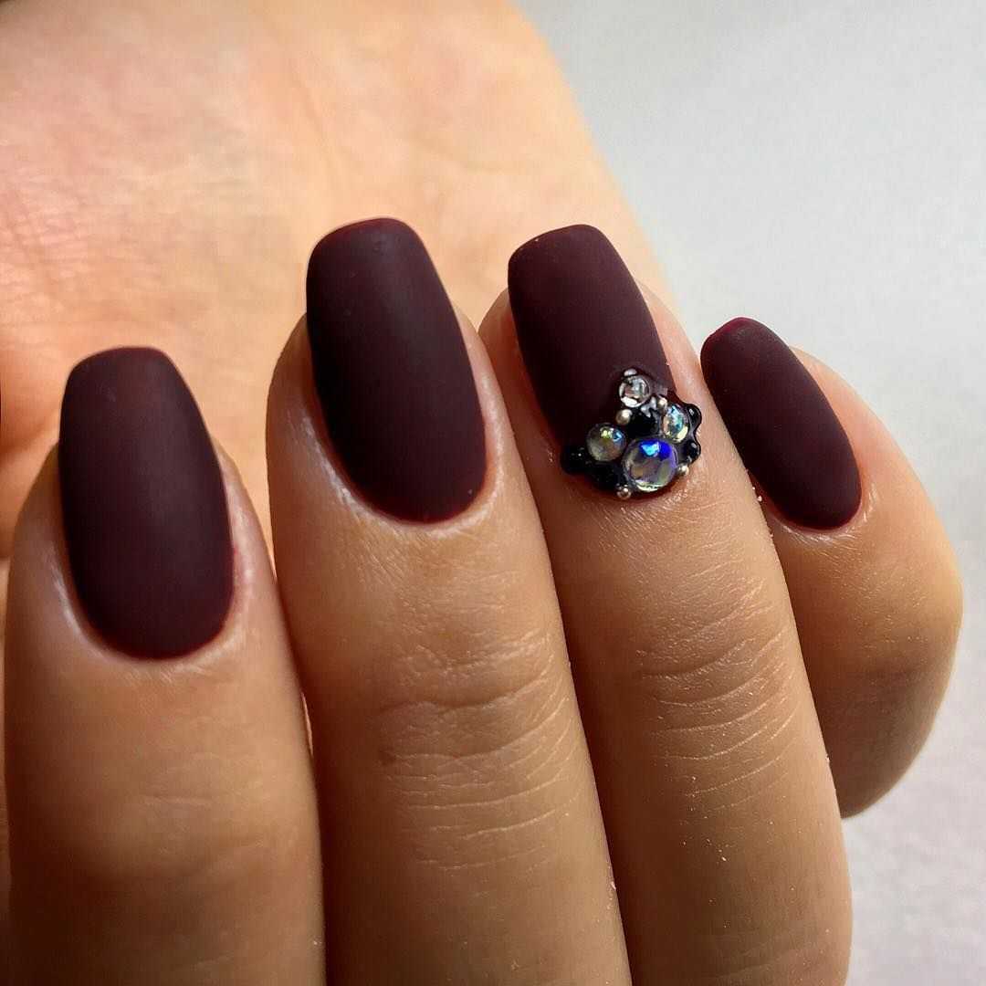 Если вы предпочитаете более сдержанный вариант маникюра, выбирайте бежевый, винный или черный цвета для матового зимнего дизайна ногтей. Поклонники чего-то более яркого могут остановить свой выбор на идеальных синих, фиолетовых и красных оттенках. Вы можете сочетать матовый дизайн ногтей с глянцевыми элементами, блестками, камифубуки, камушками или рисунками.