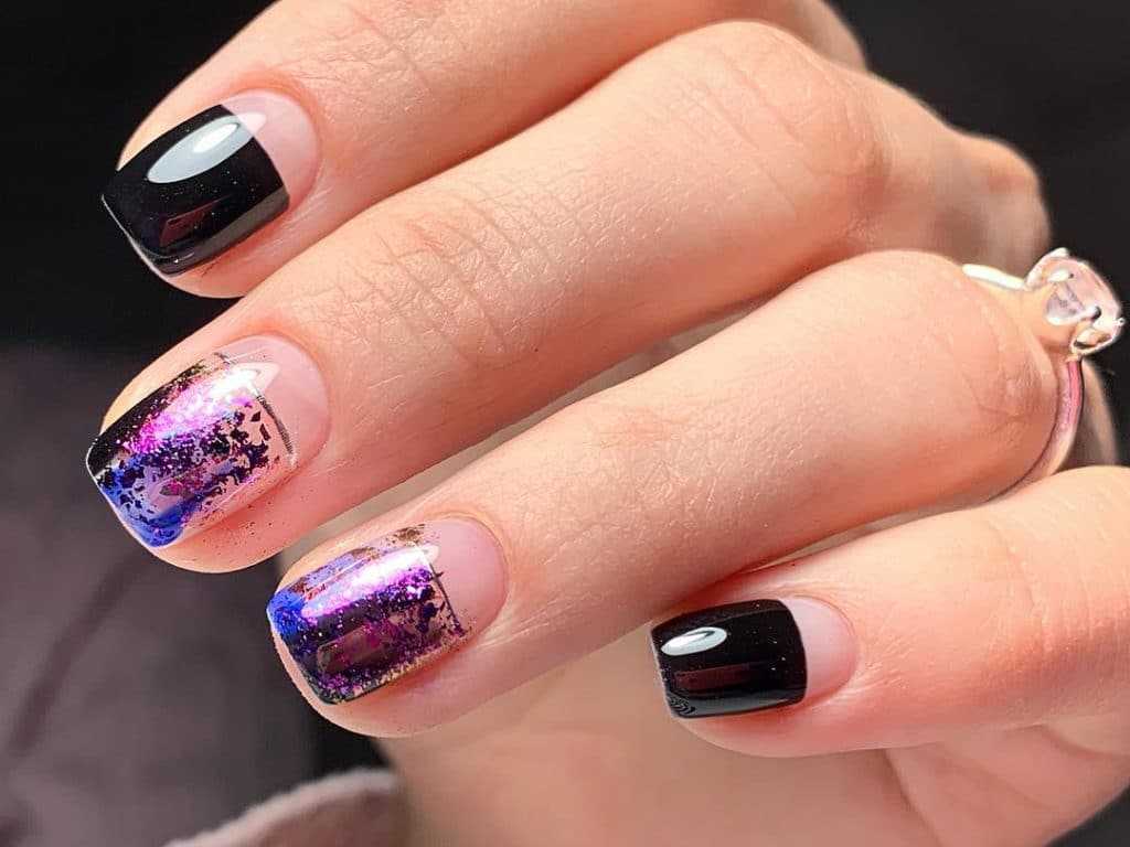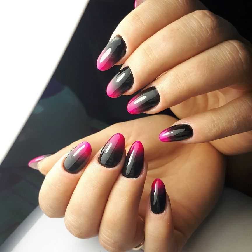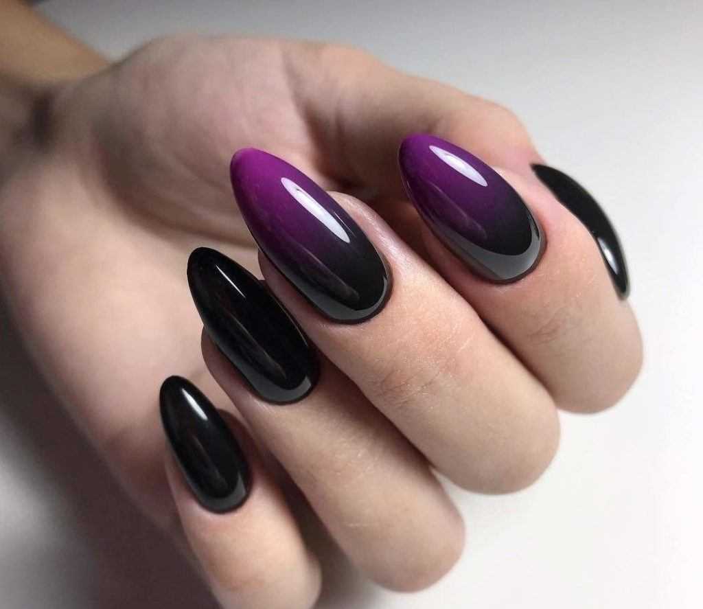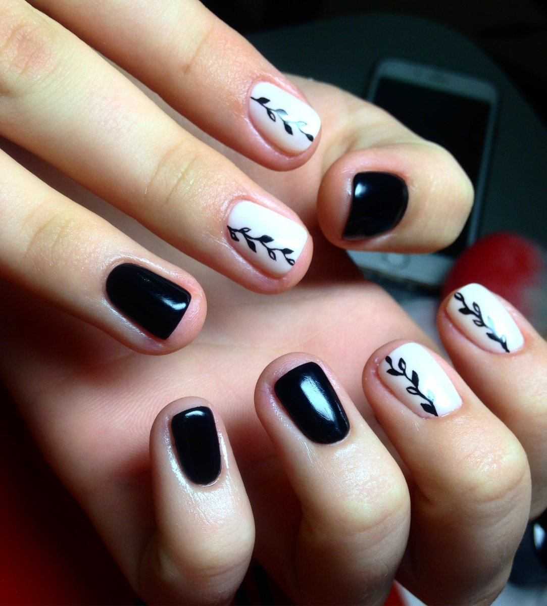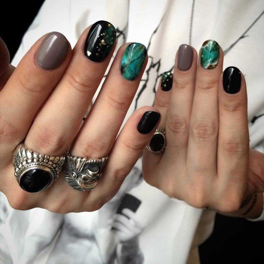 Желающим больших эмоций и красок советуем попробовать сочетание черного маникюра с пепельным или бирюзовым цветом. Очень модной будет композиция из приглушенно синего или дымчато-голубого с черным лаком. Если вам хочется более глубокого и насыщенного слияния цветов, то отлично подойдет вариант черного маникюра с бордовым, сливовым или винным оттенками.