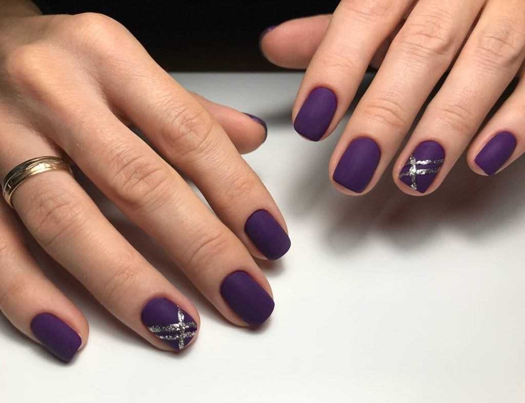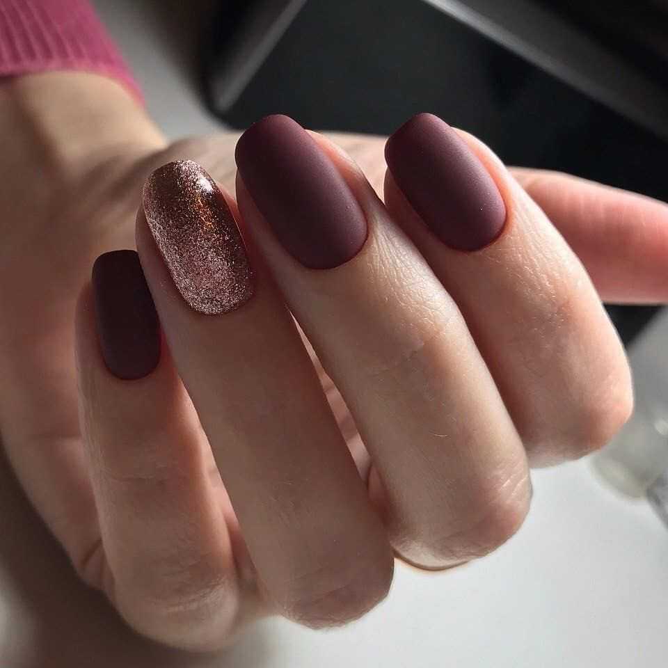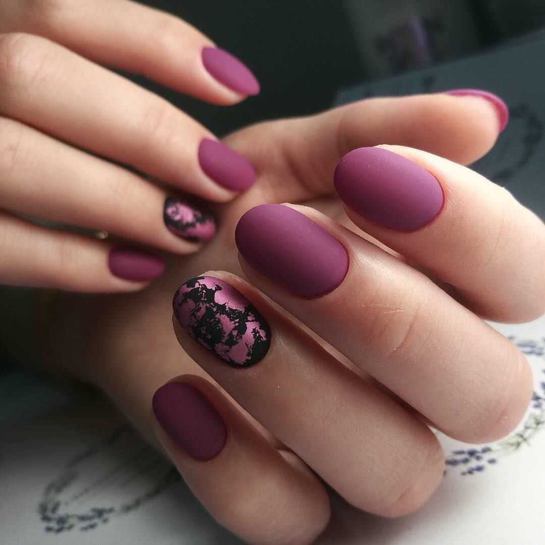 Матовый маникюр очень красиво передает глубину цвета лака и на нем шикарно смотрится любой дизайн. Для зимнего матового маникюра можно использовать темные насыщенные оттенки: черный, бордовый, фиолетовый смотрится очень эффектно, но при этом и нюдовые пастельные цвета тоже будут актуальными в 2020-2021 году.