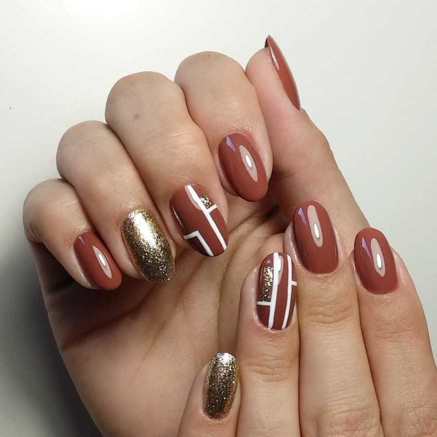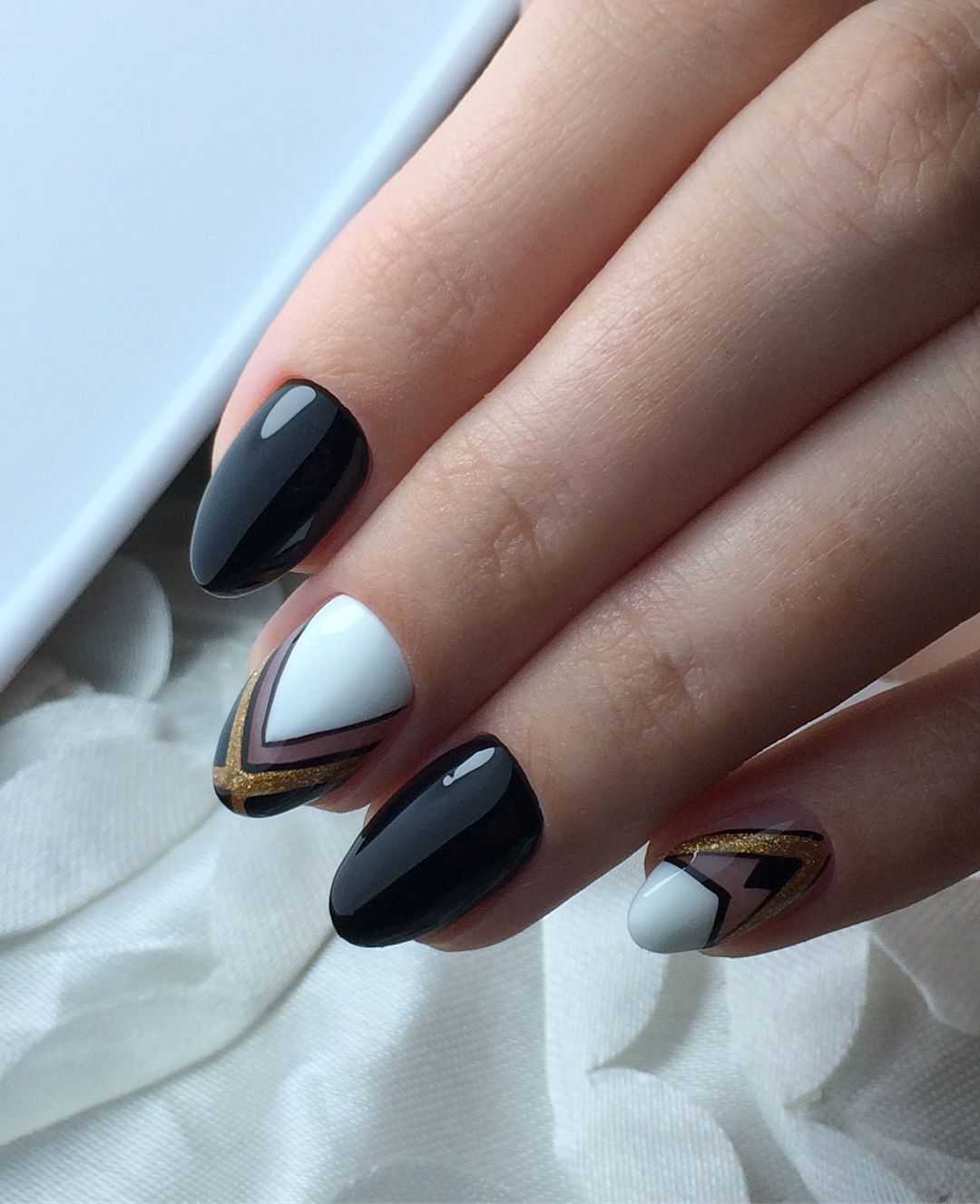 Что касается декора, можно смело использовать золотистые и серебренные горизонтальные или вертикальные полоски, а также лак с шиммером и узоры с акцентом на геометрию.