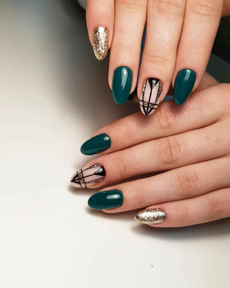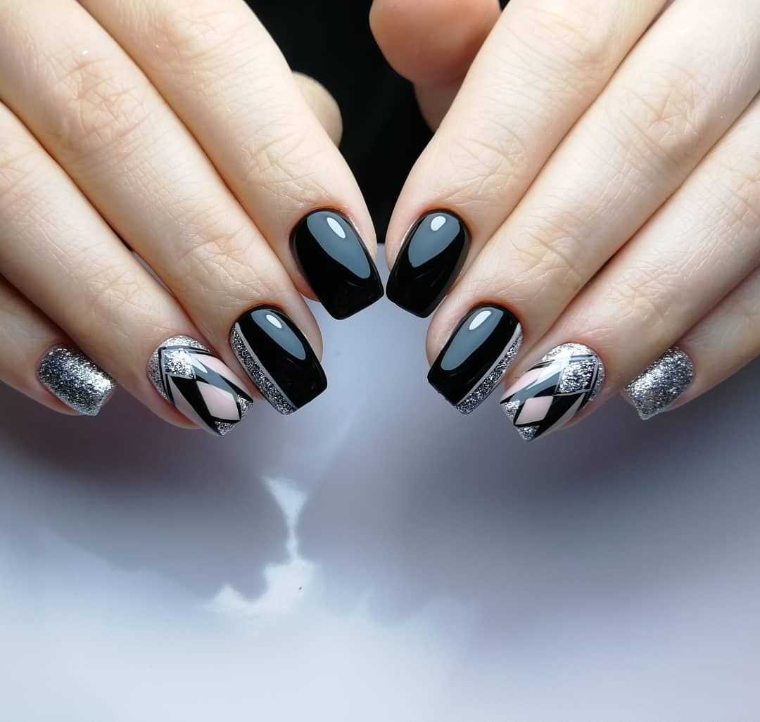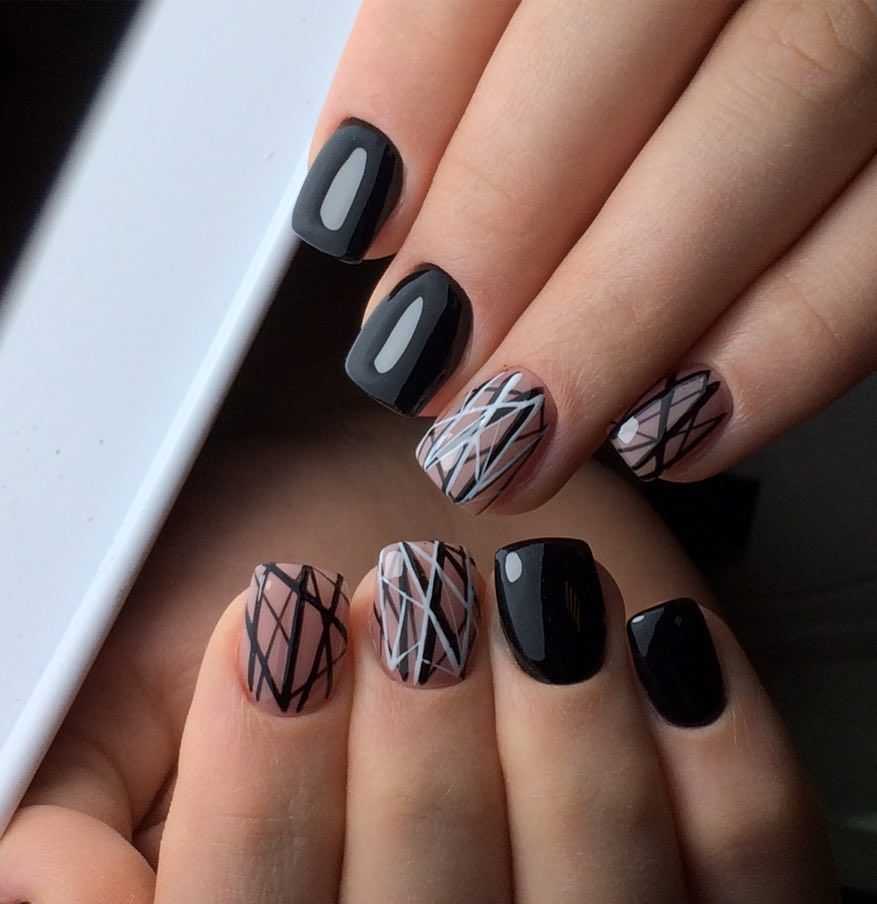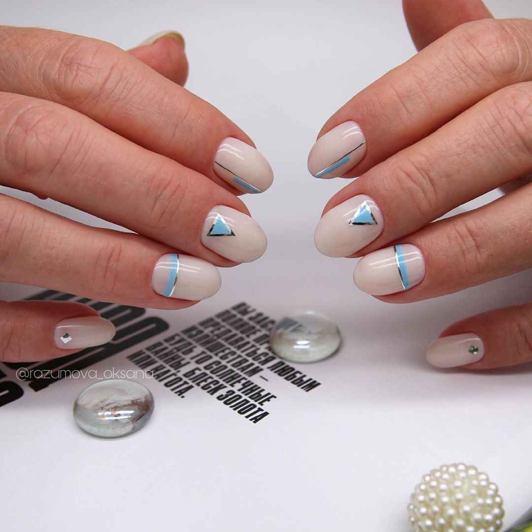 Несмотря на то, что геометрический дизайн можно делать круглый год, именно в зимнем сезоне он смотрится особенно красиво. Конечно же, многое зависит от выбранного цвета основного покрытия. Для повседневной жизни лучше подойдут нейтральные пастельные оттенки. В свою очередь, для вечернего выхода или посещения какого-то мероприятия больше подойдут темные, глубокие тона. Непосредственно дизайн можно выполнить с помощью скотч-ленты. Различные полоски и их пересечения в серебристом или золотистом цвете смотрятся особенно стильно. При желании их можно выполнить из блесток, что тоже добавляет маникюру оригинальности.