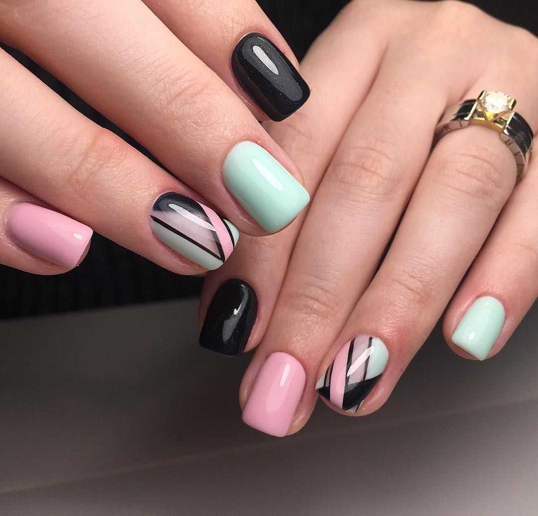 • чёрно-белые фигуры – прекрасное решение в виде шахматной клади, горохового полотна, стилистики инь-янь, полосатого ремейка в чёрно-белом стильном окрасе подходит на любой случай – и на вечеринку, и на повседневную носку. Особенно уместно использовать подобный арт на короткие ногти – это придаст им очерченности и выразительности; • геометрическая атмосфера – также уместно использовать маникюр в виде рисунка из пересечения прямых и округлых линий, кругов, квадратов и треугольников, клети или сети, точечных дисперсий и различного рода геометрических росписей в различном тональном свете. Смотрятся такие ноготки нескучно и притягательно;• мозаичная кладь – невероятный ногтевой дизайн, отличающийся сложностью в прорисовке, но предполагающий яркий и элегантный результат от проделанной работы