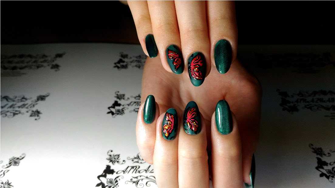 Выбирать дизайн также следует в зависимости от формы пластин. Острые, форму ногтей балерина лучше украсить бабочкой сбоку. Для квадратных, миндалевидных, овальных подойдет изображение по всей поверхности. На длинных ногтях можно прорисовать мельчайшие детали: усики, жилки крылышек.
