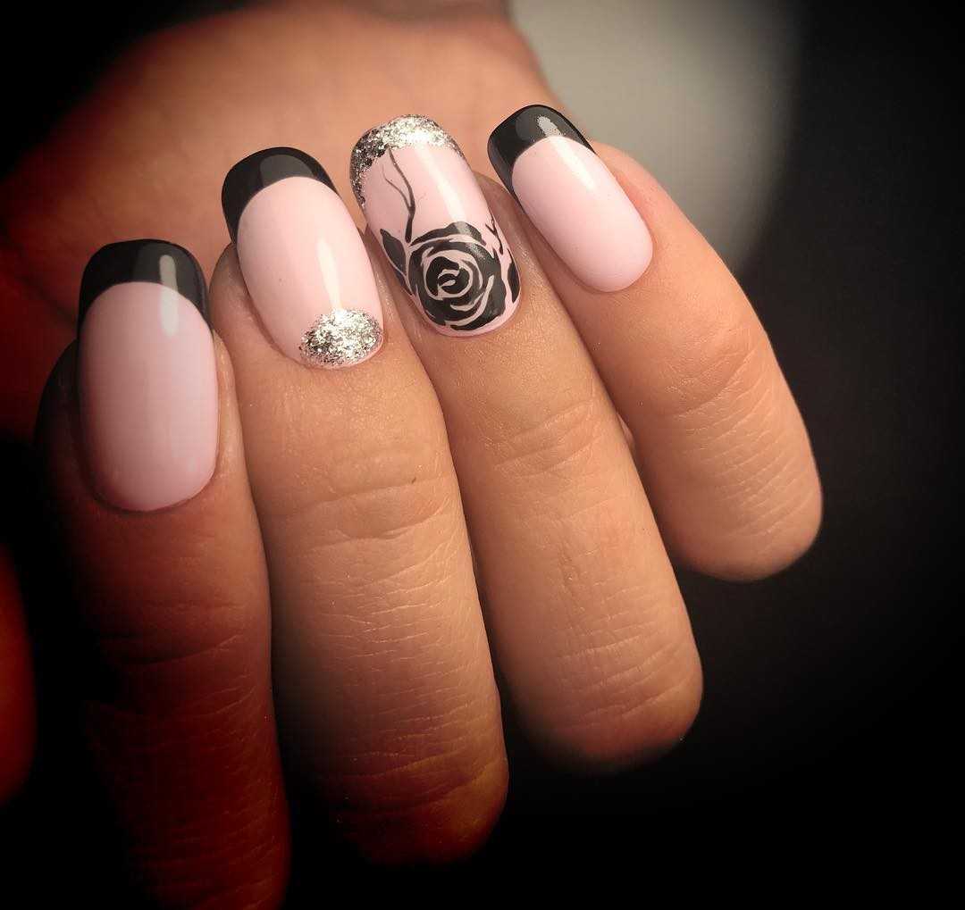 Элегантно смотрится френч в черном цвете. Он превосходно сочетается с розовой основой и блестящим декором. Один ноготь полностью покрывается черным лаком и декорируется стразами.