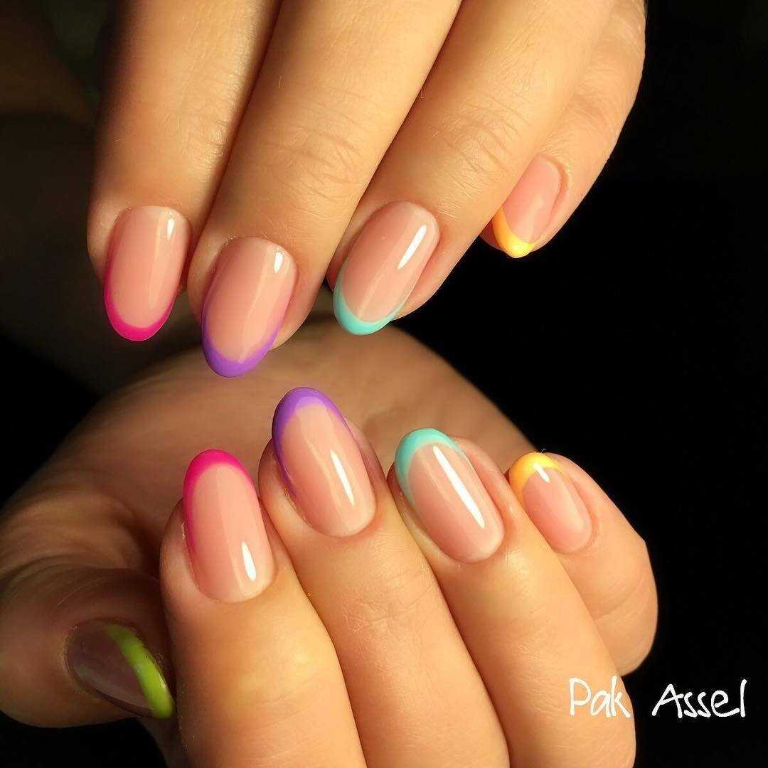 Остальную часть ногтевой пластины обычно покрывают нейтральным цветом, чтобы он не отвлекал внимание от разноцветного декора