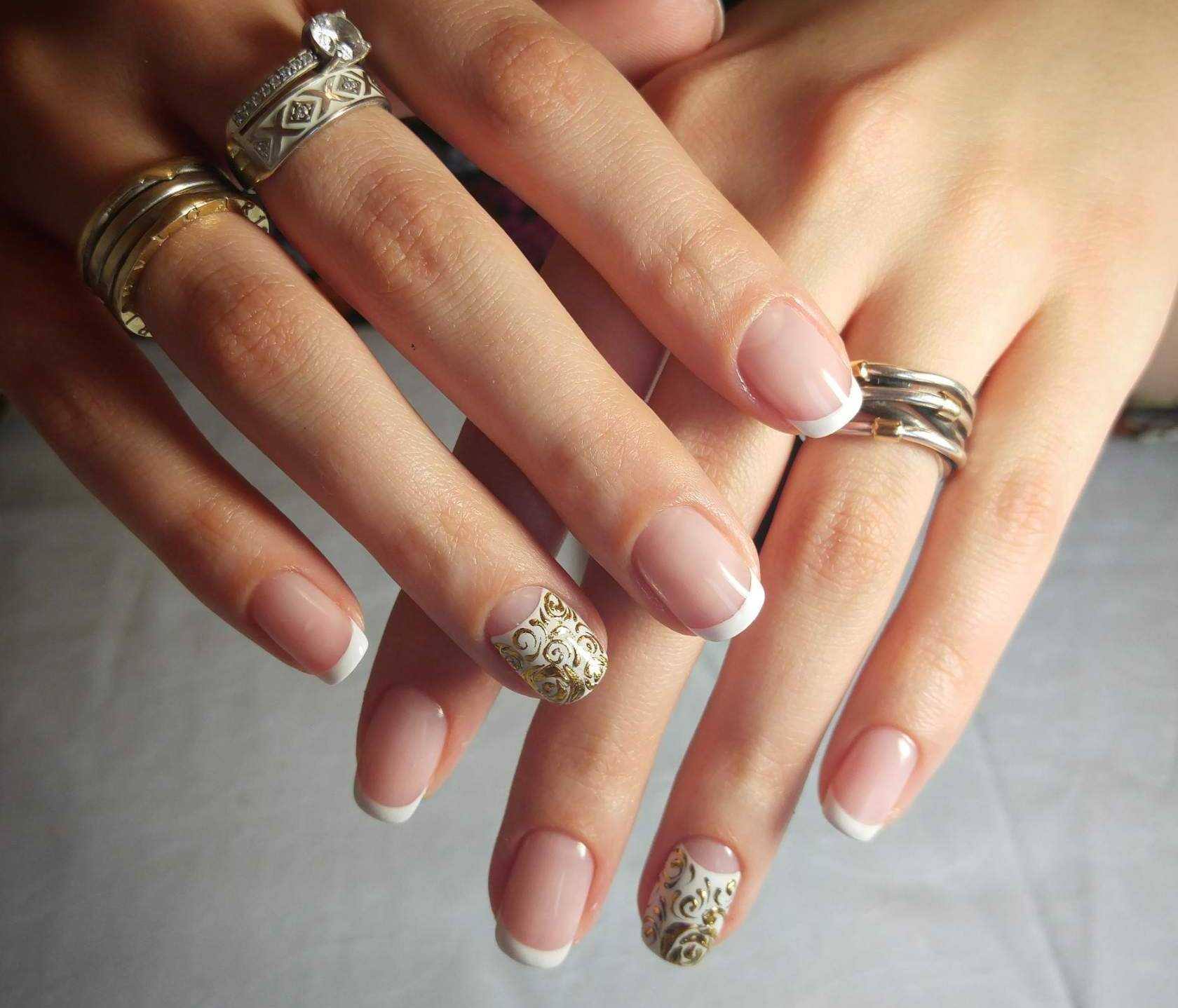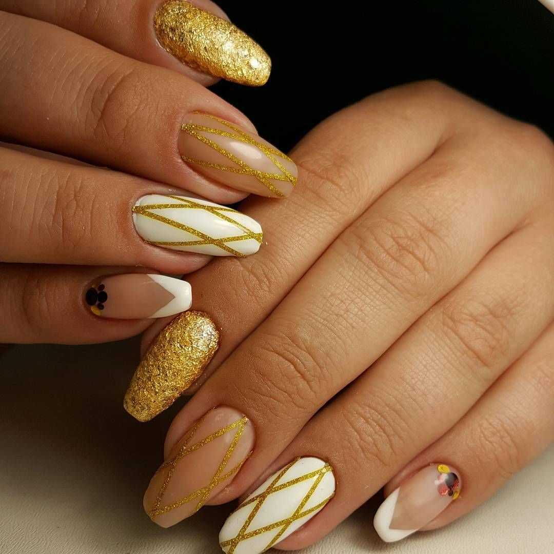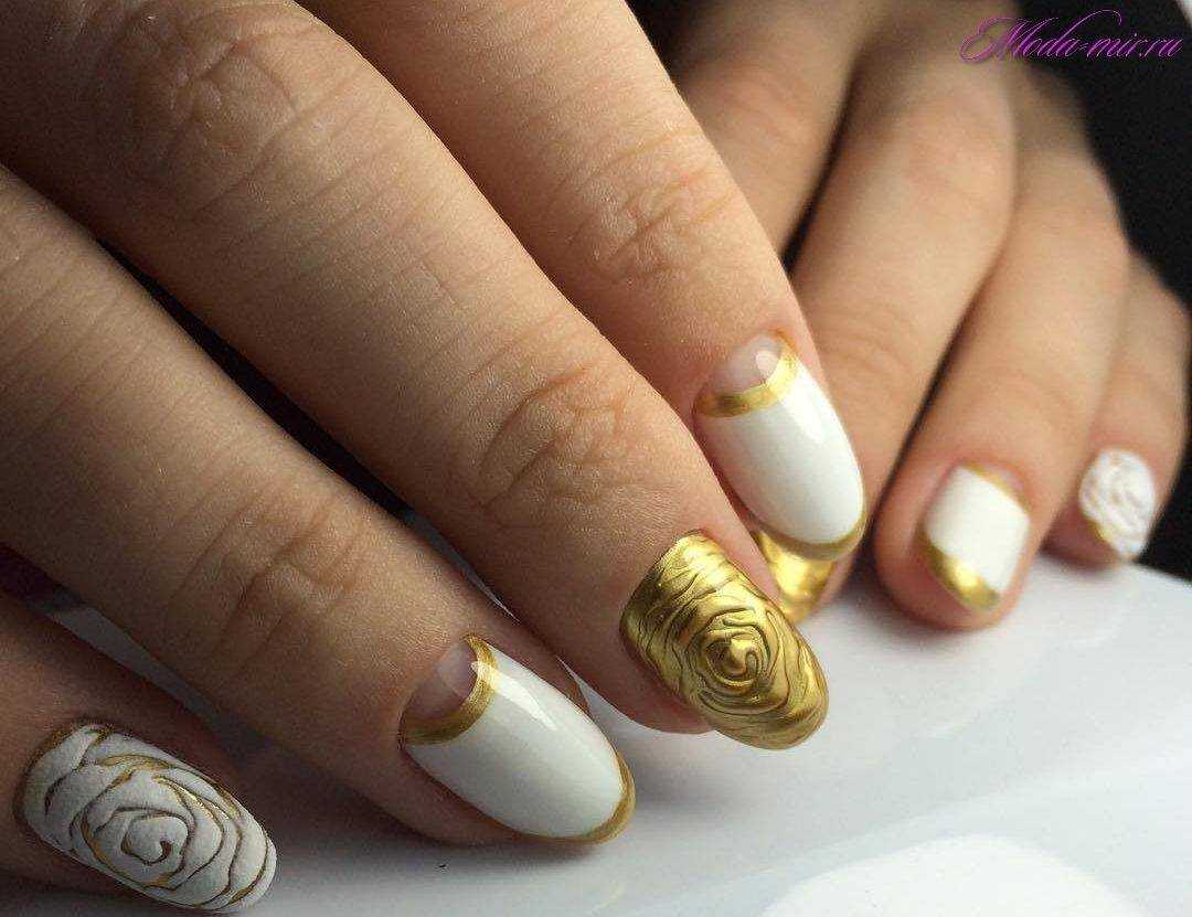 Не менее популярным является сочетание белого и золотого цвета. Маникюр с их использованием зачастую получается более скромным. Он идеально подходит для нежных и романтичных натур.
