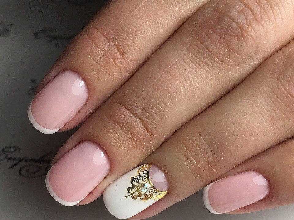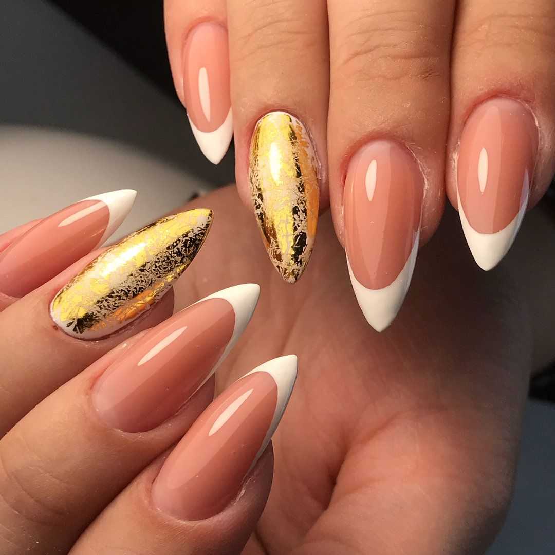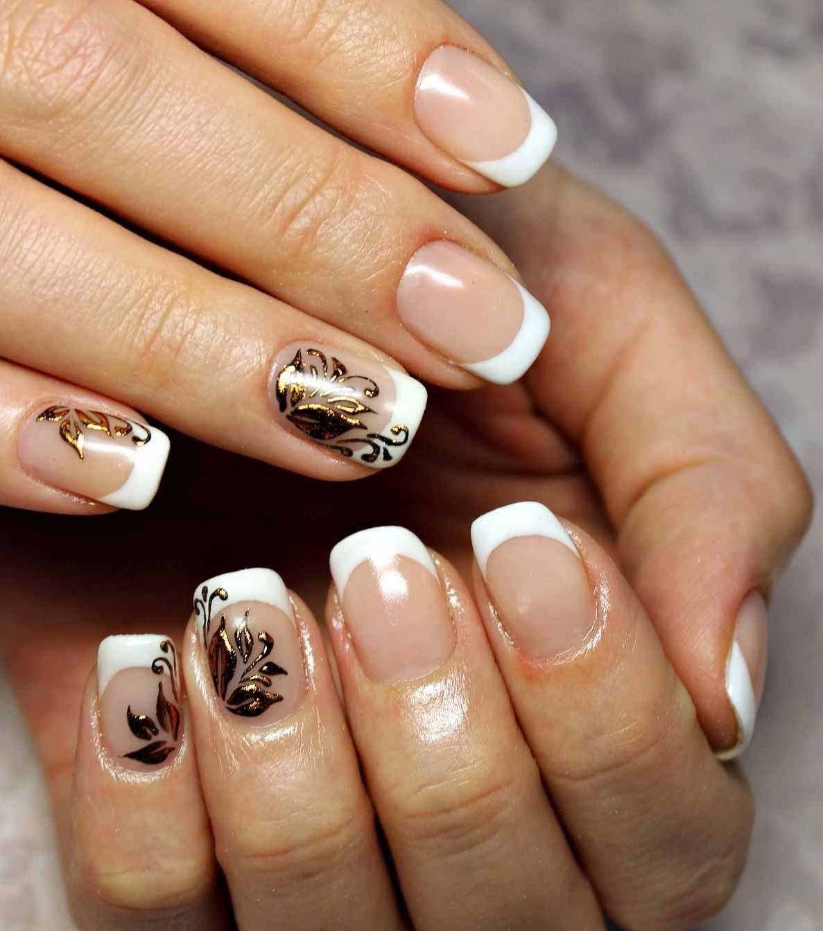 Не менее популярным является сочетание белого и золотого цвета. Маникюр с их использованием зачастую получается более скромным. Он идеально подходит для нежных и романтичных натур.