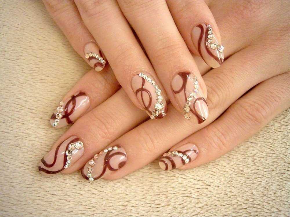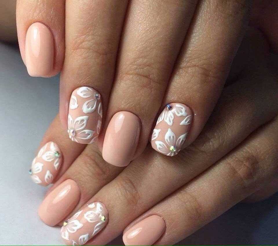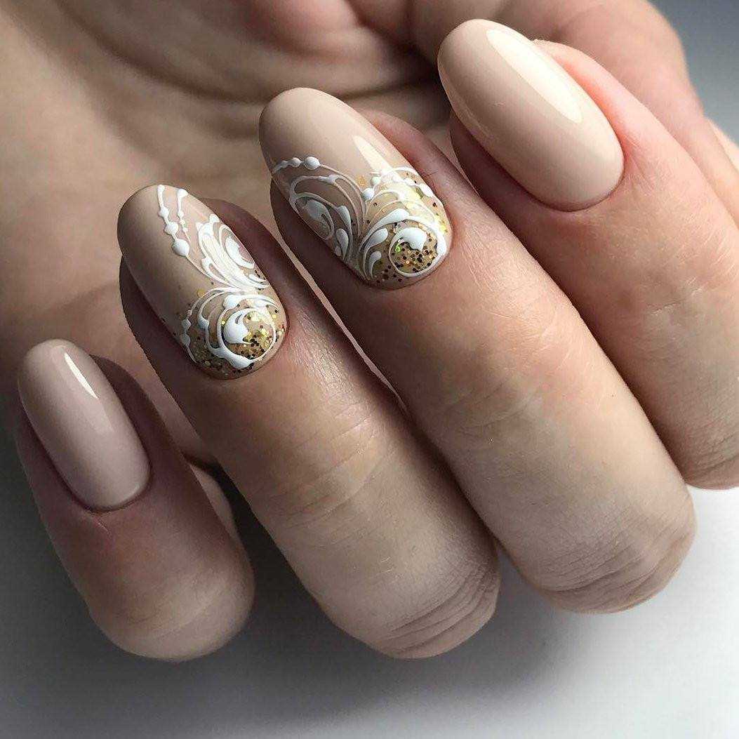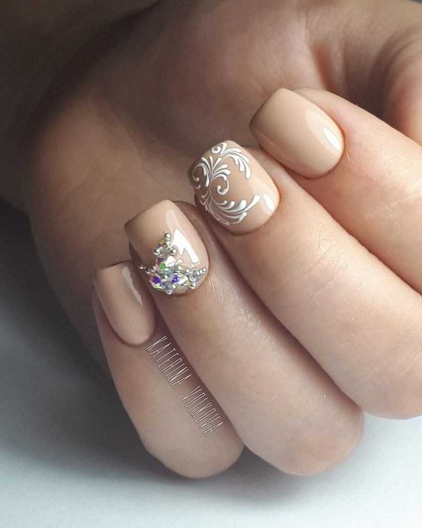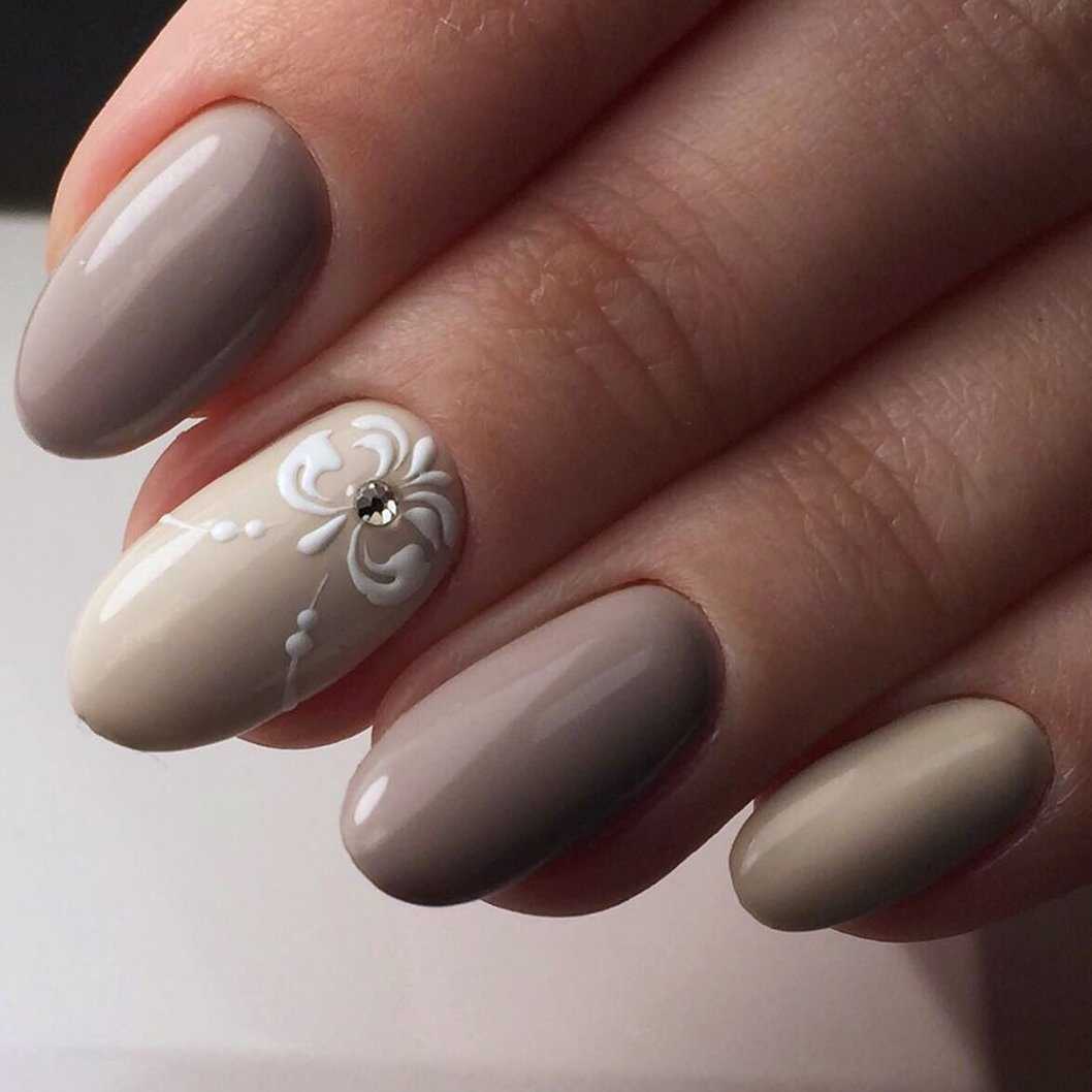Узоры на бежевом покрытии смотрятся весьма изысканно. Чаще всего встречаются разновидности узоров белым цветом. Это смотрится одновременно женственно, нежно и изыскано. Праздничным маникюр сделают стразы, в небольшом количестве наклеенные на один или два ногтя.