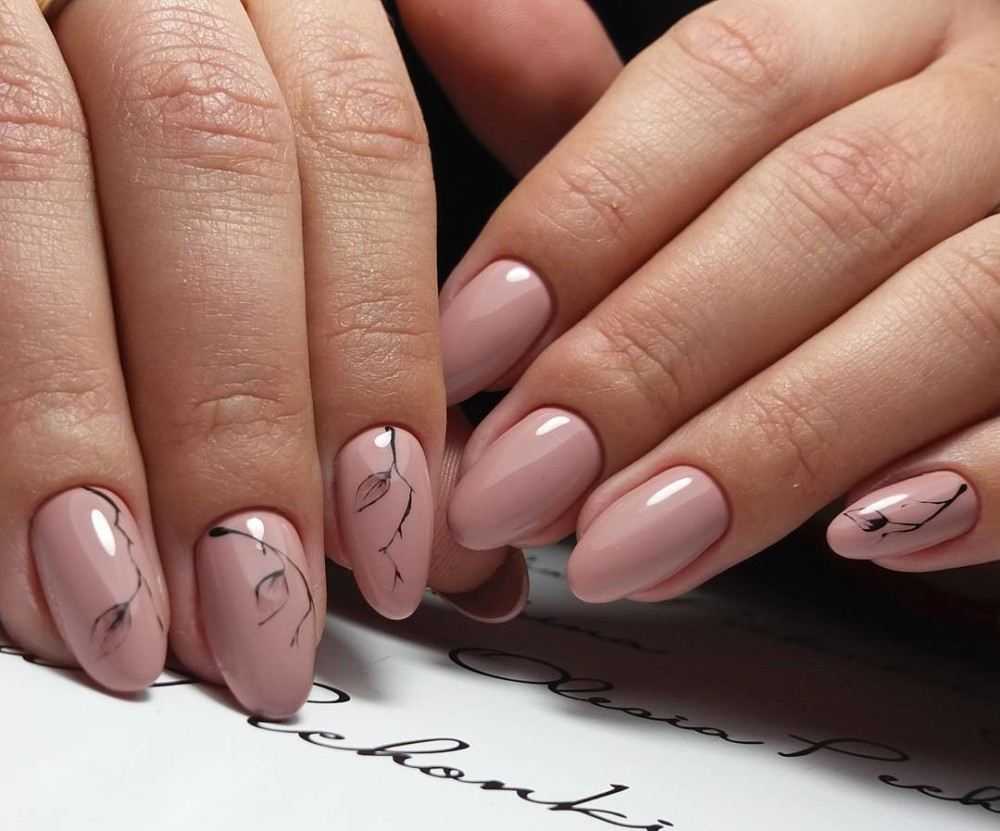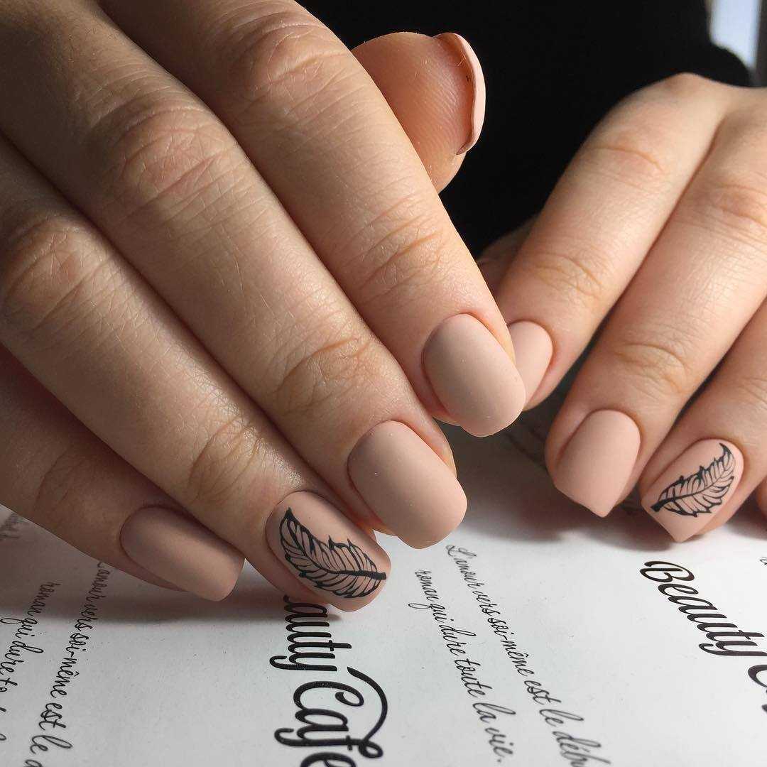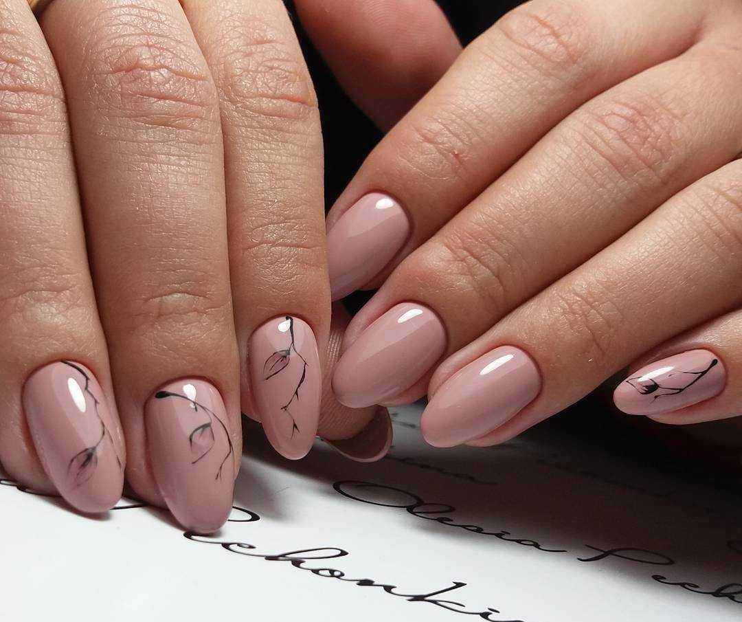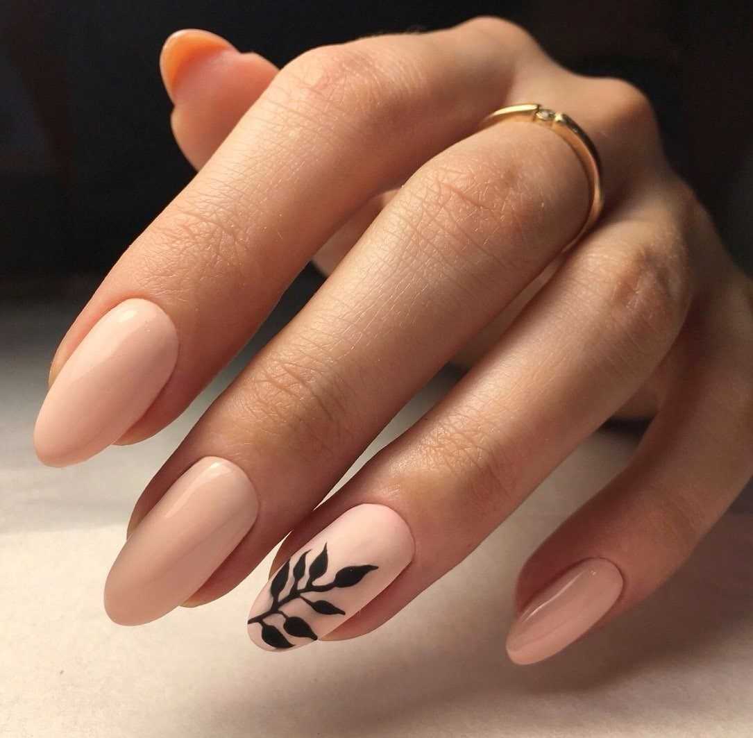 В тренде однотонное окрашивание ногтей в бежевый и розовый. Популярностью пользуются матовые нейл-арты, которые смотрятся еще нежнее и благороднее. Что касается декора, то на бежевом фоне красиво смотрятся веточки и листья, аккуратные полоски и точки, стразы и камни в прикорневой зоне. При желании можно дополнить бежево-розовый маникюр белым или черным гель-лаком. Сделайте с помощью этих дополнительных оттенков красивый акцентный декор с цветами или геометрией.