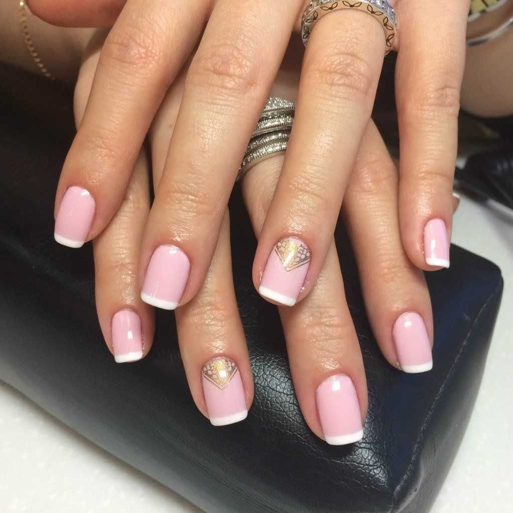 Французский маникюр нередко сочетают с геометрическим дизайном. В таком случае главным преимущественно является черный цвет. Непосредственно рисунок также может быть выполнен в данном оттенке. Золотой цвет чаще используется только в качестве акцента на ноготках, где нанесен дизайн. Благодаря такому сочетанию маникюр получается сдержанным, но при этом ярким.