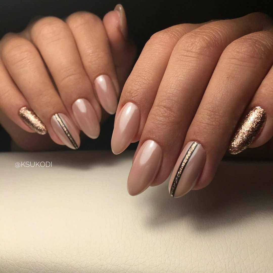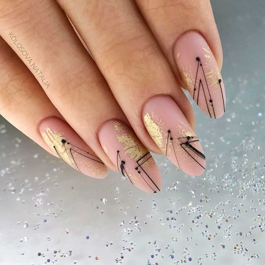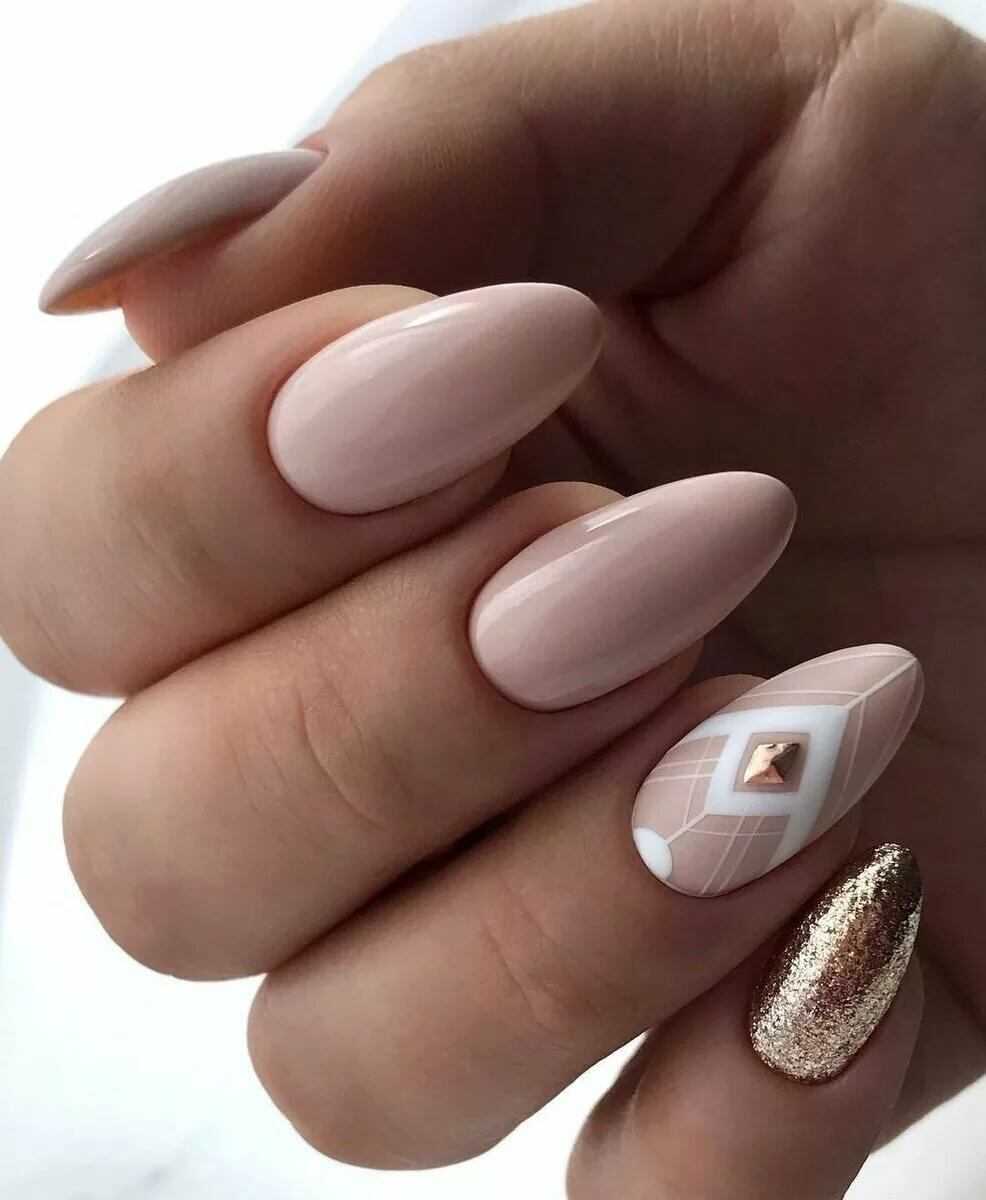 Альтернативой сочетанию с белым станет комбинация бежевого и золотого. Всевозможные геометрические узоры золотом, окрашенные отросшие части или изящные линии оживят монотонность бежевой поверхности ногтя.