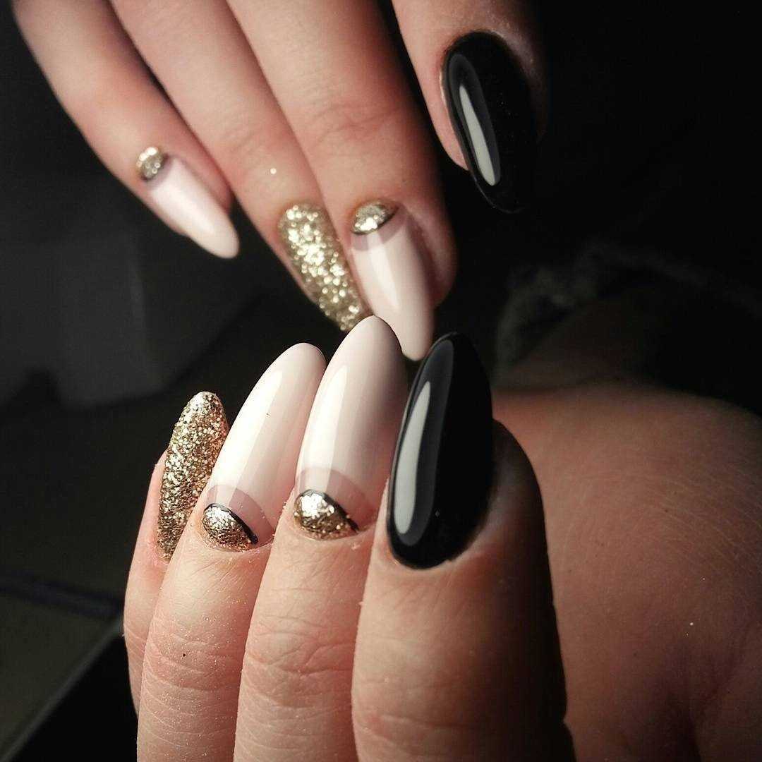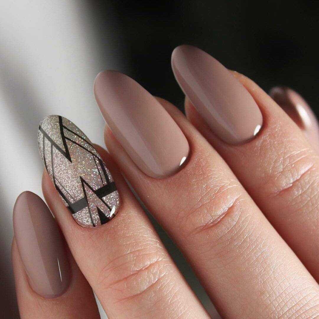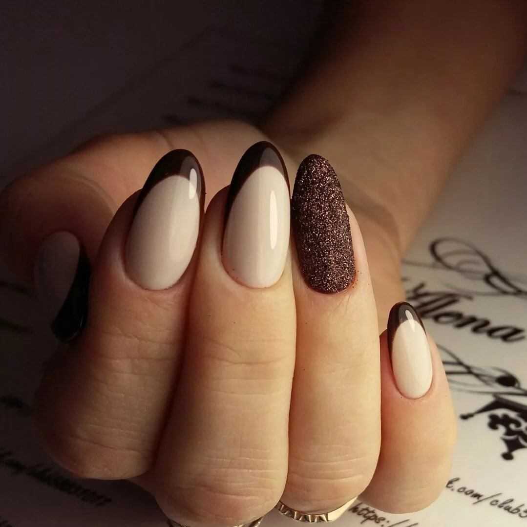 Бежевый цвет шикарно выглядит в сочетании с черным, почти чернильным цветом. Дизайн смотрится броско и заметно, ваши ноготки не останутся без внимания. В черно-бежевом маникюре можно использовать такие популярные техники как:
