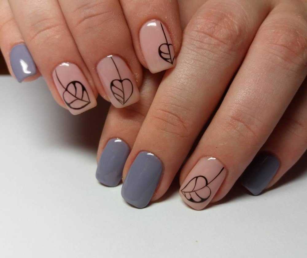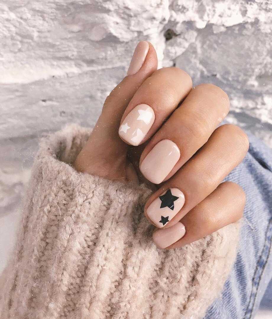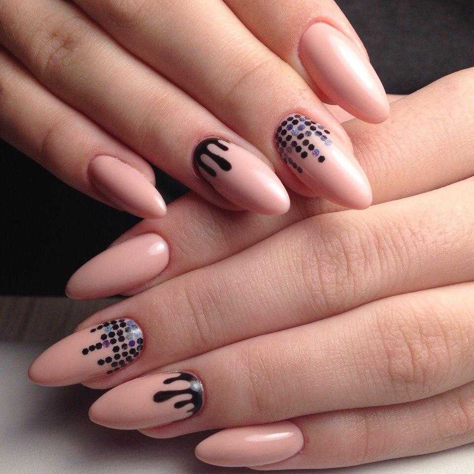Бежевый цвет шикарно выглядит в сочетании с черным, почти чернильным цветом. Дизайн смотрится броско и заметно, ваши ноготки не останутся без внимания. В черно-бежевом маникюре можно использовать такие популярные техники как:
