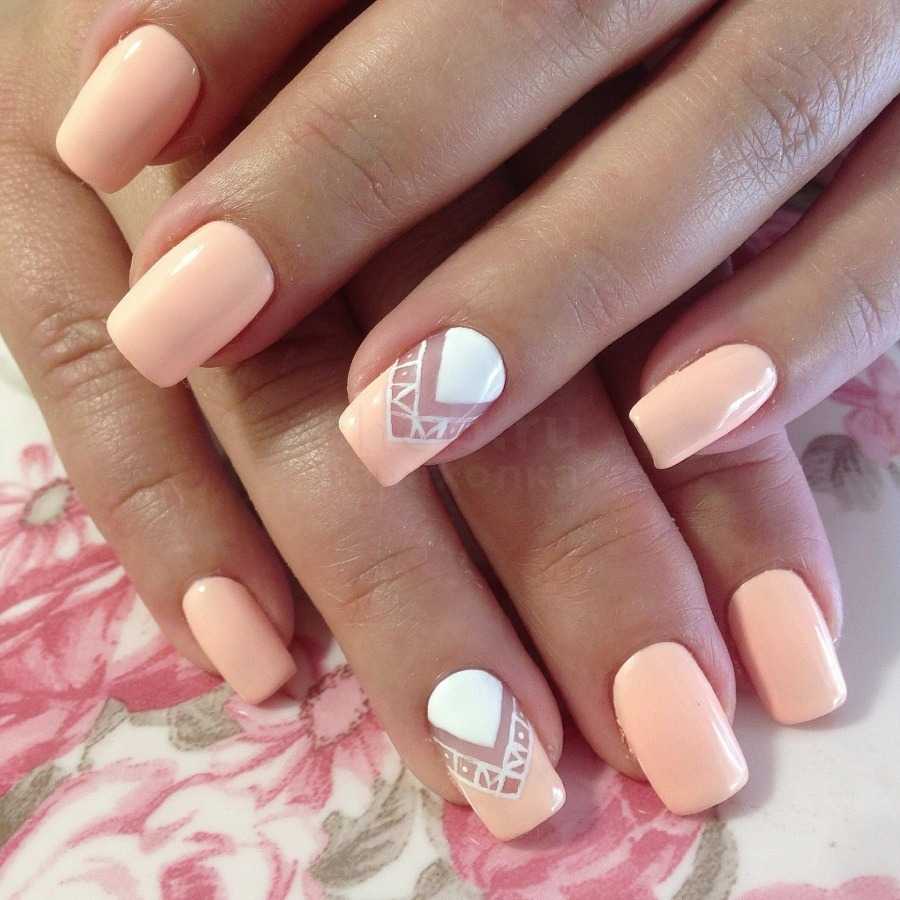 Белый лак очень хорошо сочетается со всеми бежевыми оттенками, можно сделать маникюр лишь используя этих два цвета, а можно еще дополнить интересным рисунком или техникой нанесения.