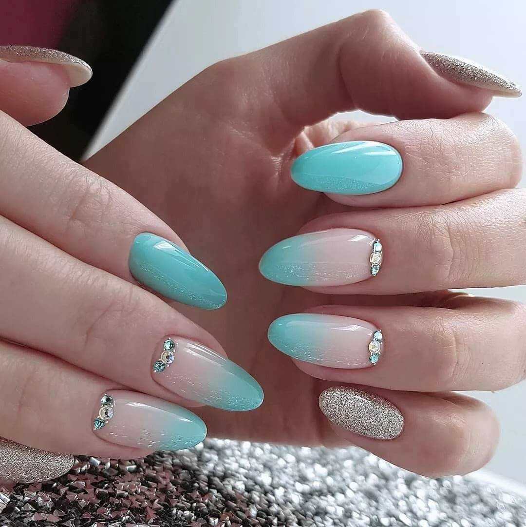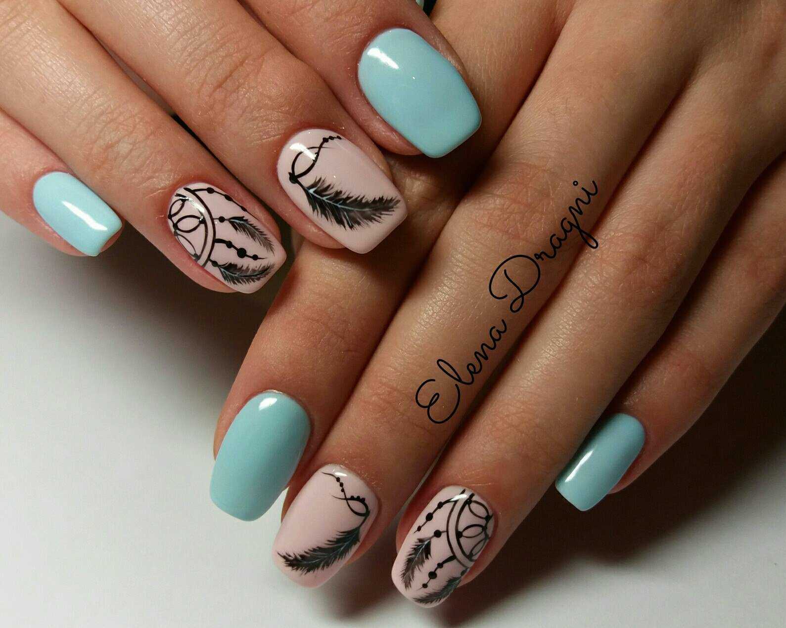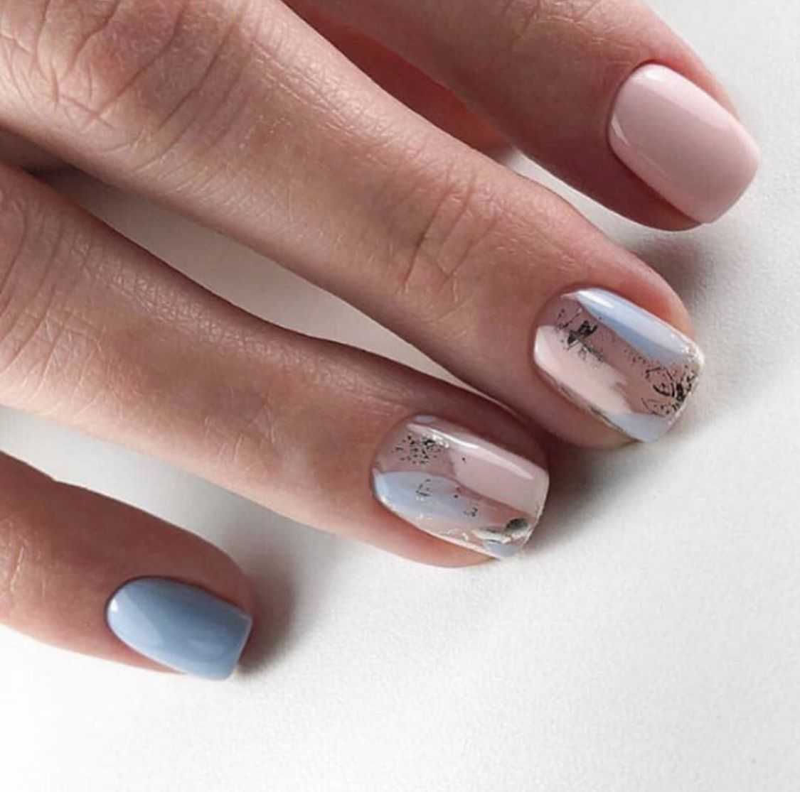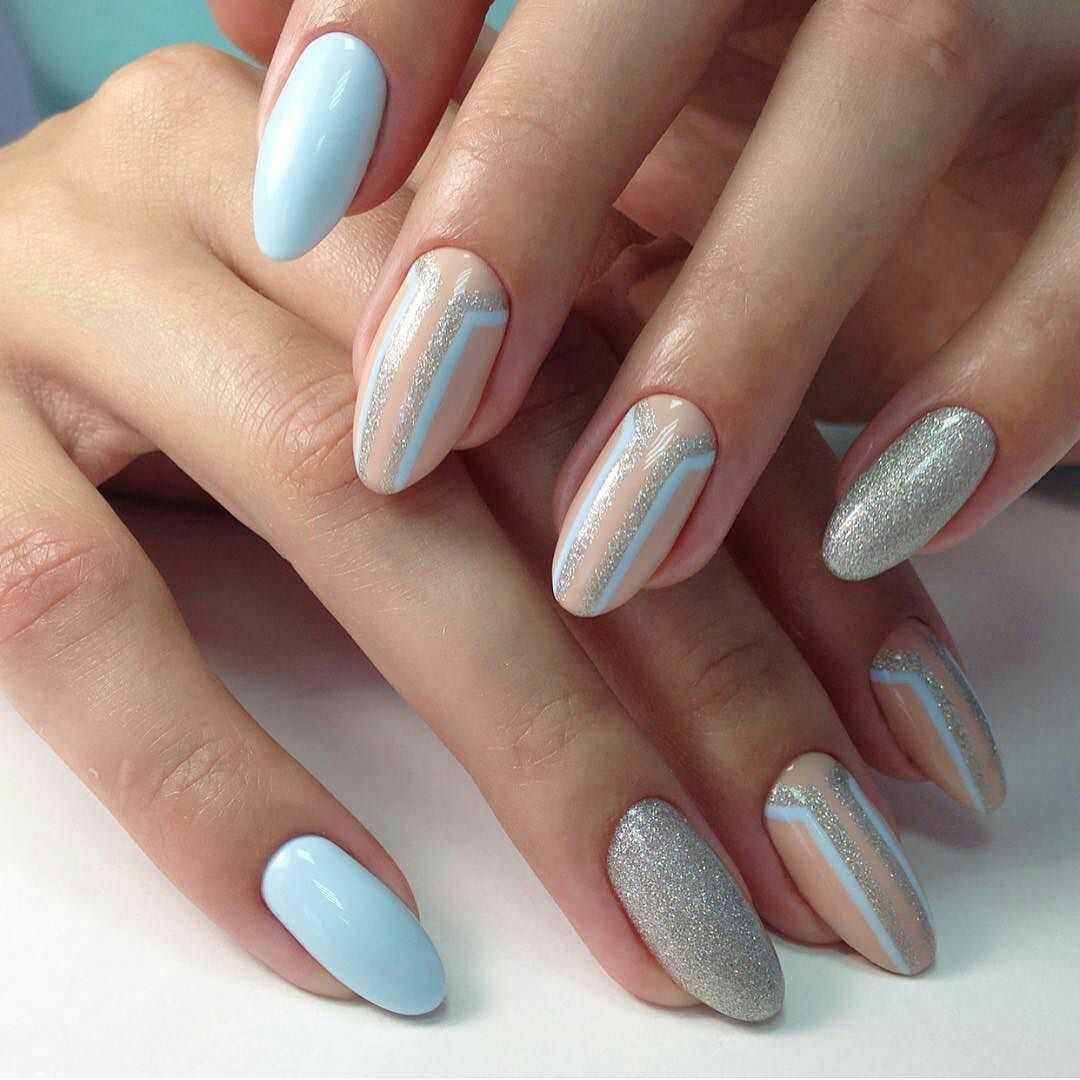 Интересное сочетание голубого лака с телесным бежевым поможет создать творческий и красивый образ. такое сочетание выглядит очень стильно на ногтях любой длины.