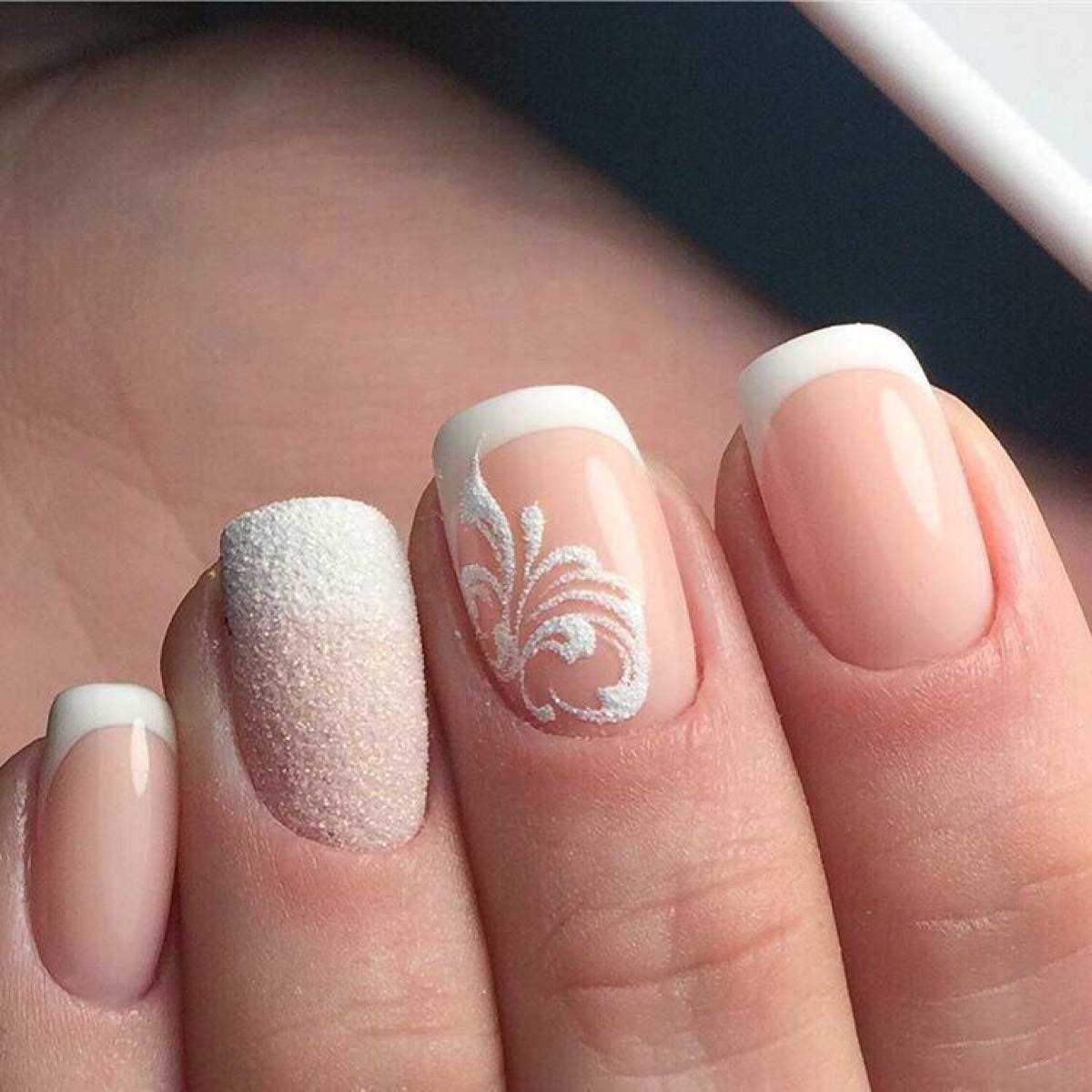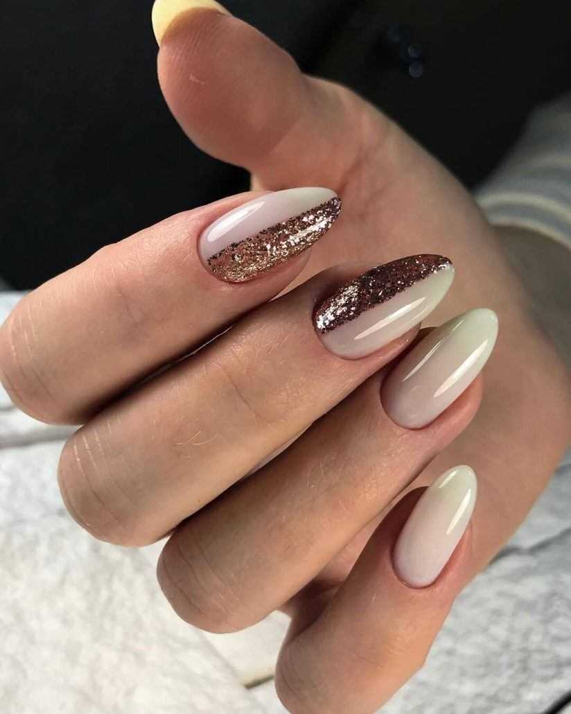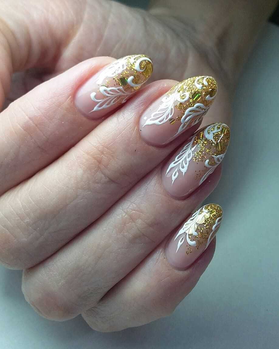Основным в данном случае является белый цвет. В свою очередь, золотой цвет используется только в качестве акцента. Это может быть небольшой рисунок, россыпь блесток или полное покрытие ноготка на безымянном пальце. В каждом из вариантов маникюр получается праздничным, но в то же время сдержанным и лаконичным.