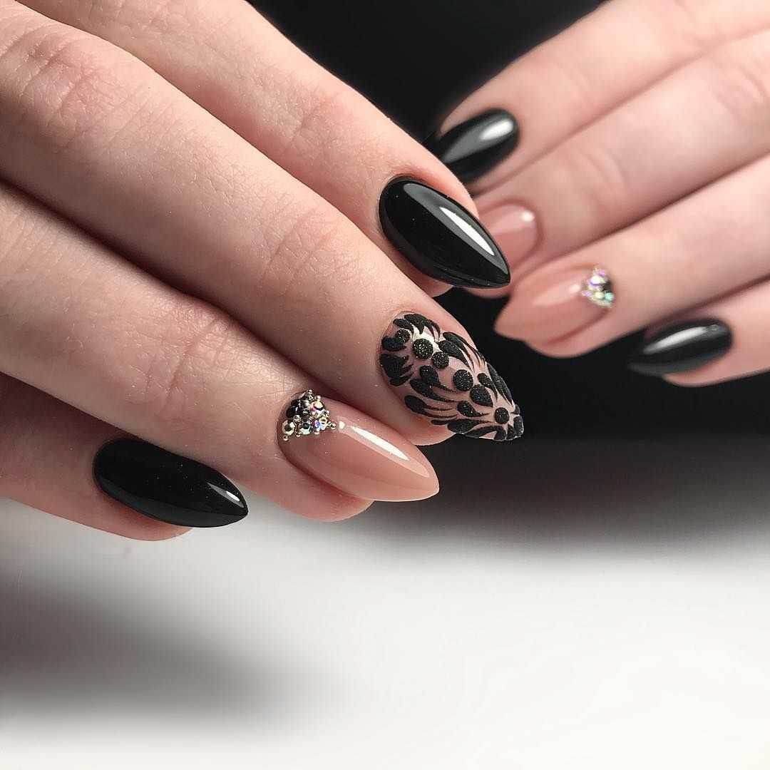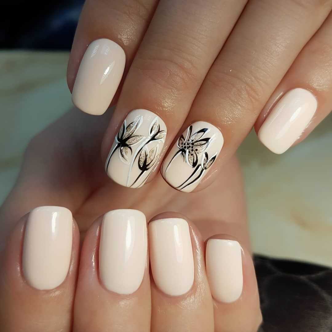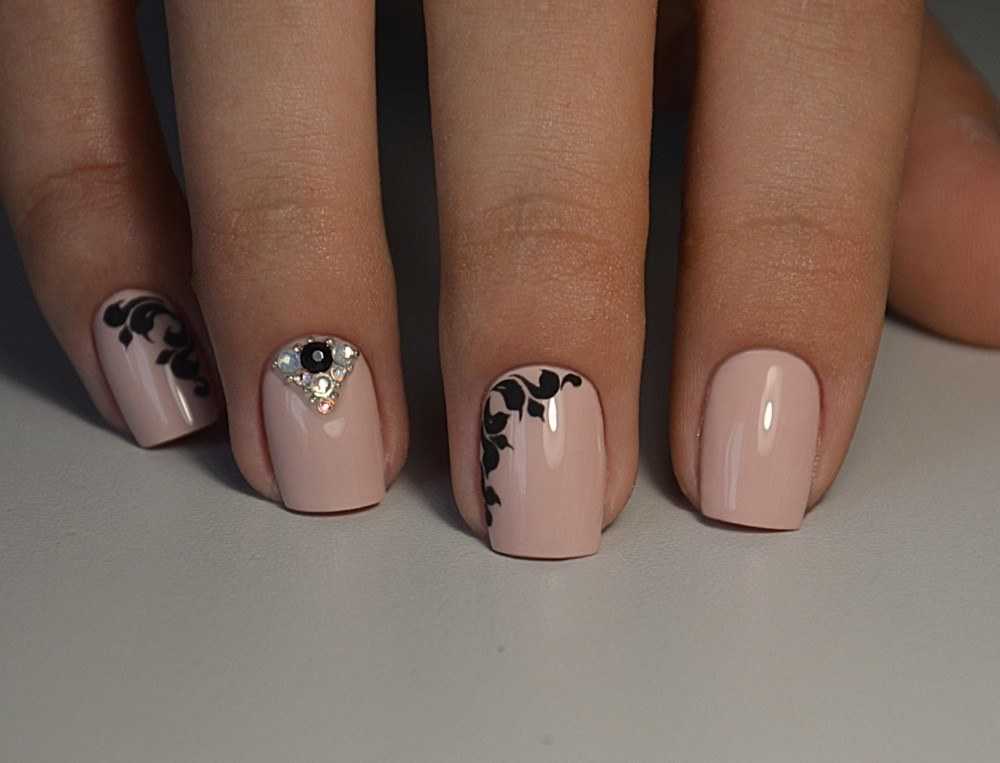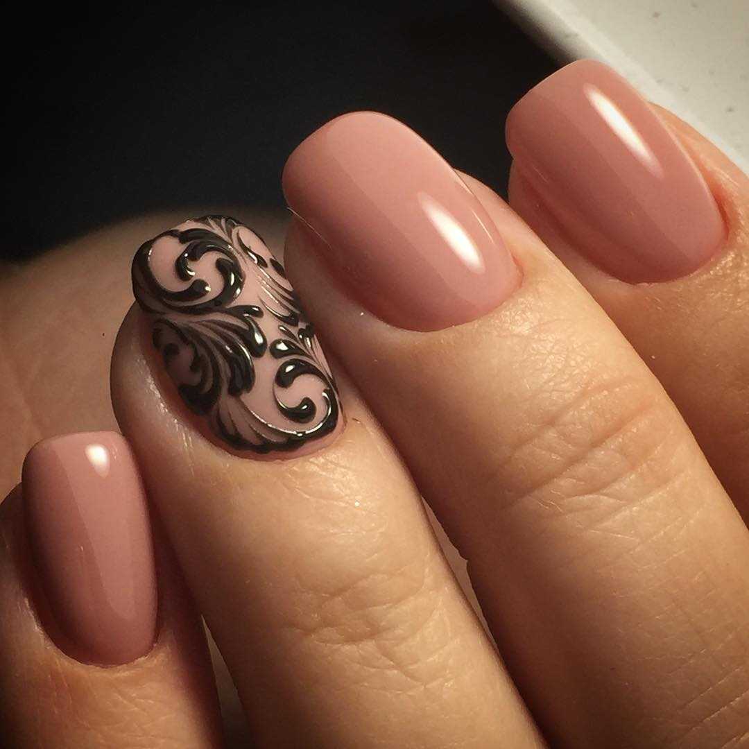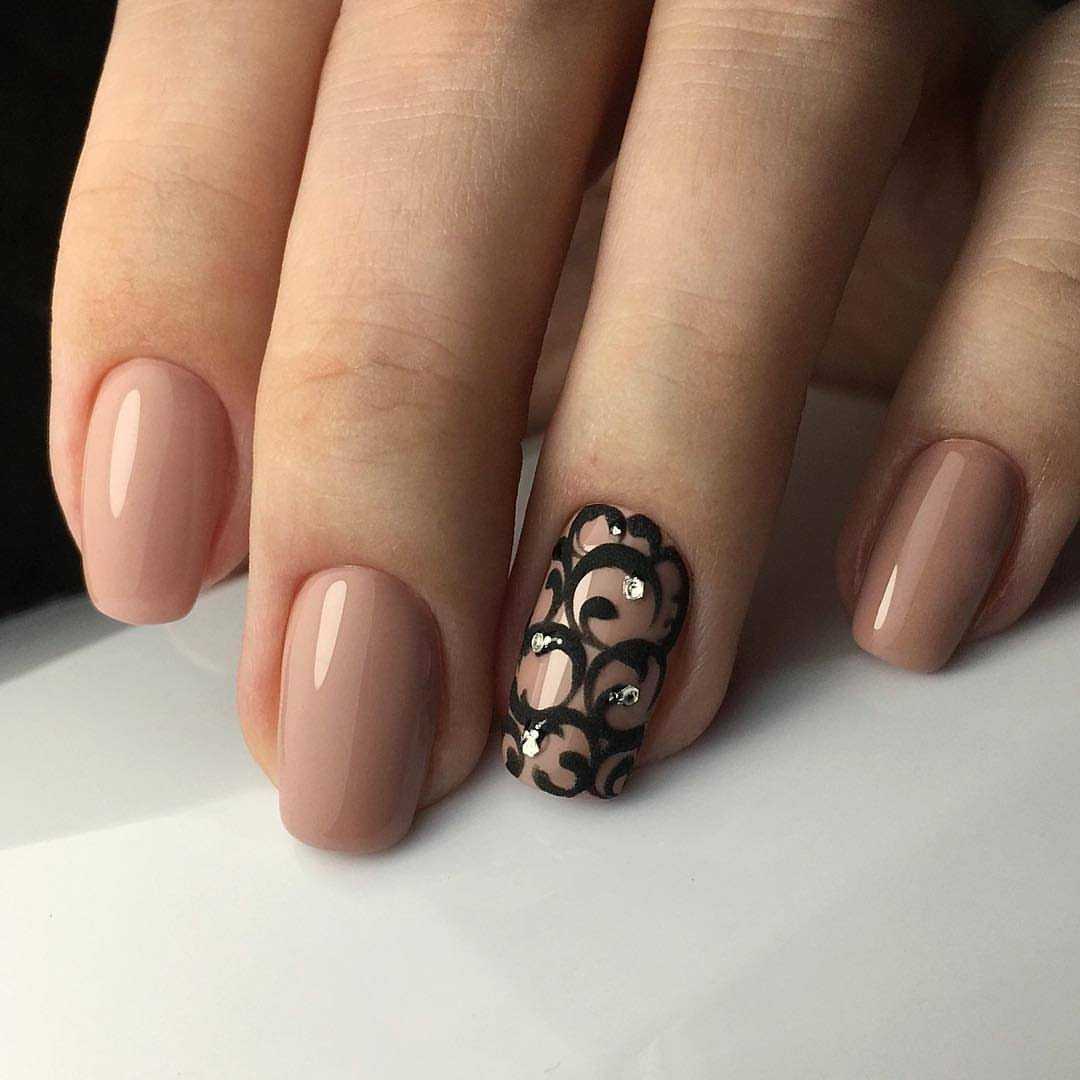 Классической комбинацией станет сочетание бежевого с еще одним базовым цветом – черным. Этим цветом можно рисовать узоры, окрашивать часть ногтя или несколько ногтей полностью. Подобный маникюр может легко стать частью строгого офисного стиля и вместе с тем придавать образу оригинальности. В черном варианте на бежевых ногтях великолепно смотрится подобие кружева или паутины.