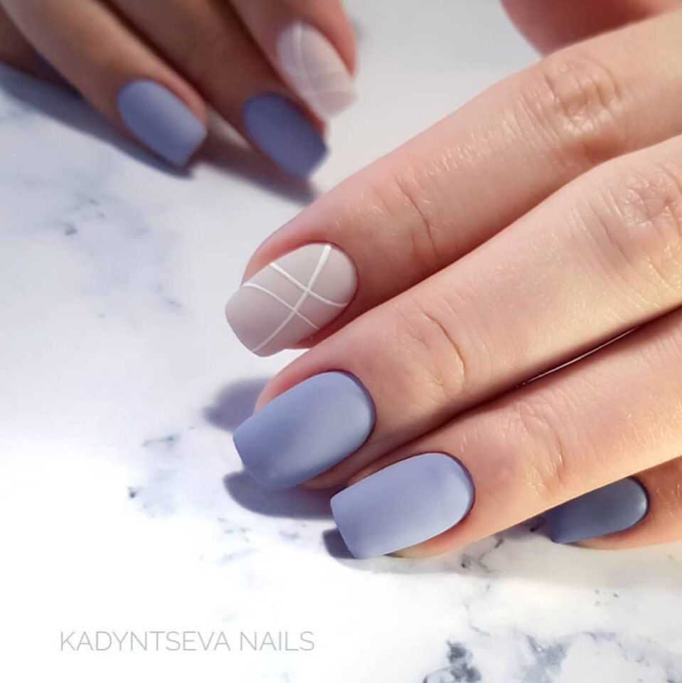 Сочетание бежевого и голубого великолепно смотрится в матовой текстуре. Такое покрытие делает дизайн еще нежнее и благороднее. Используйте фольгированные полосы или серебряный глиттер, чтобы разнообразить нежный бежево-голубой нейл-арт.