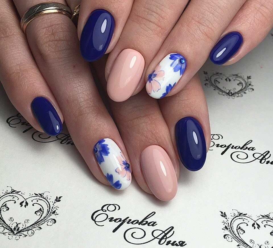 Необычное и яркое сочетание бежевого маникюра с синим. Есть несколько вариантов, как правильно сочетать эти цвета в маникюре: