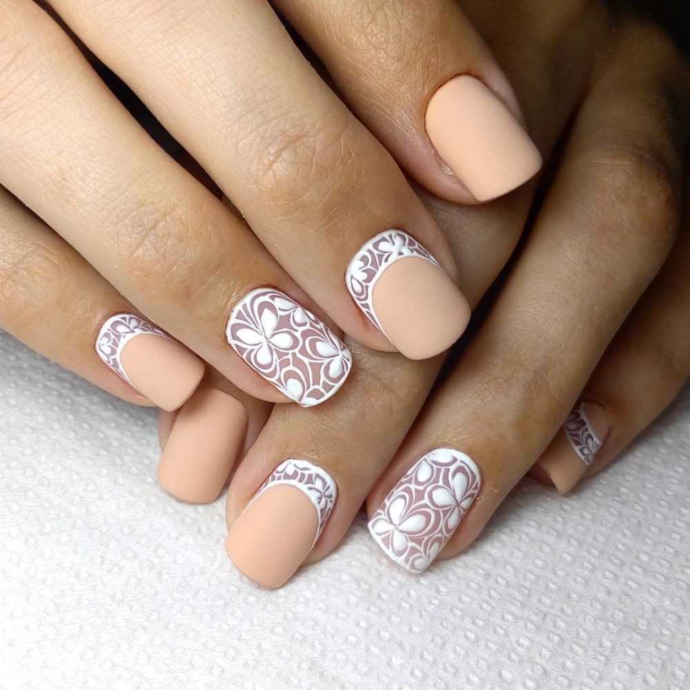 Красиво и женственно смотрится кружевной маникюр в белом и бежевом цвете. Такое сочетание оттенков и декора облагораживает ноготки, делает образ девушки интереснее и сдержаннее. Кружево можно выполнить с помощью стемпинга или ручной росписи. При желании дополните маникюр стразами или глиттером.