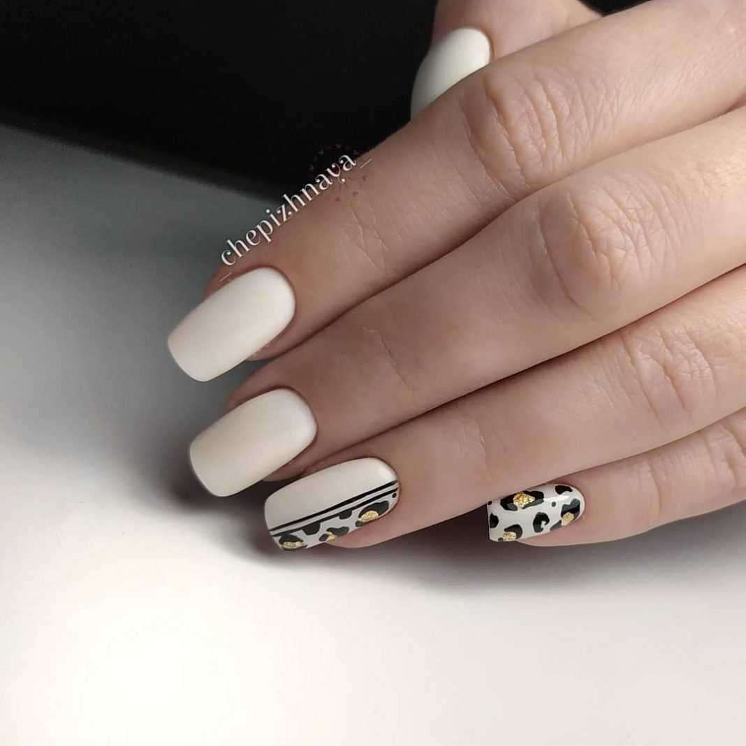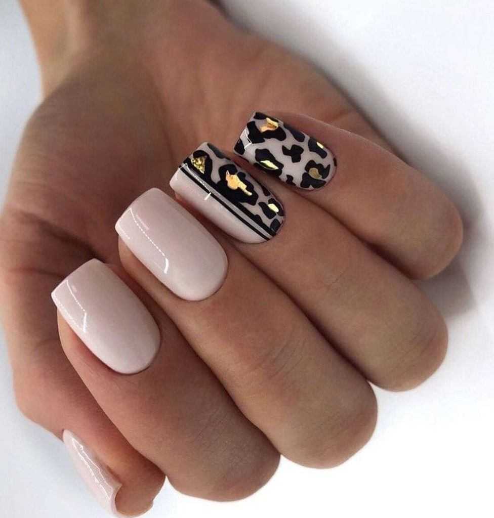 Хищный принт особенно удачно получается в бежевом цвете. Оттенок смягчает вызывающий узор, делает маникюр благороднее. В качестве дополнения используйте различные оттенки коричневого: медный, светло-коричневый, охра и другие. Интересно смотрится маникюр с геометрическим декором, который заполнен хищным принтом. Примеры такого нейл-арта вы можете видеть на фото ниже.