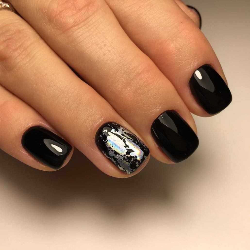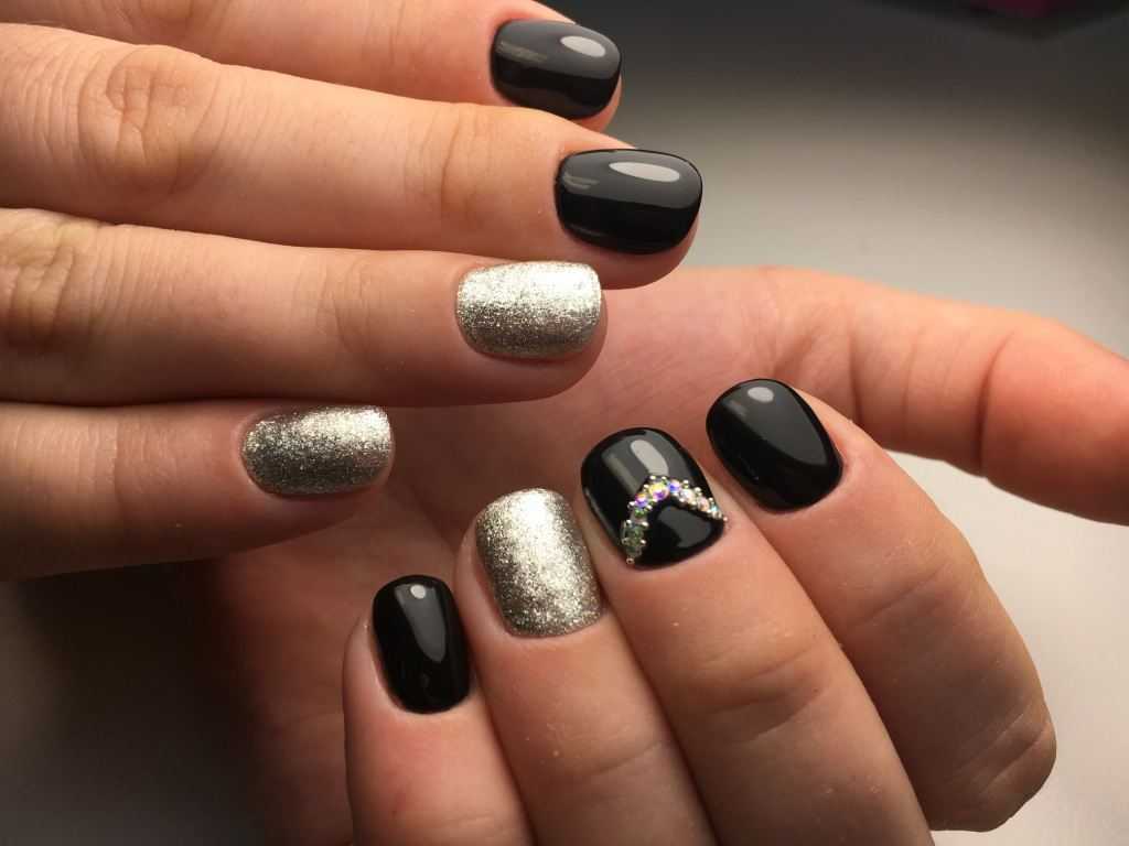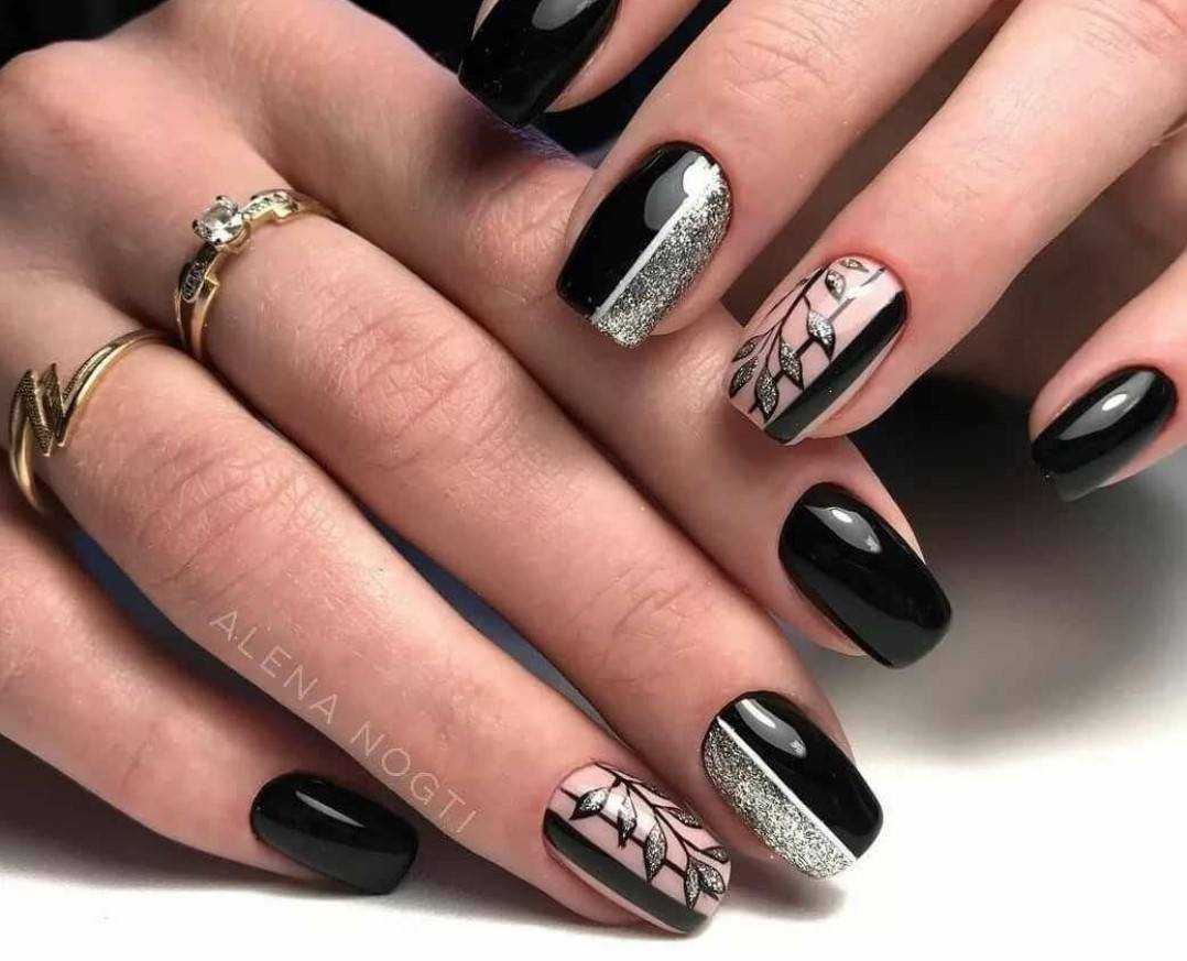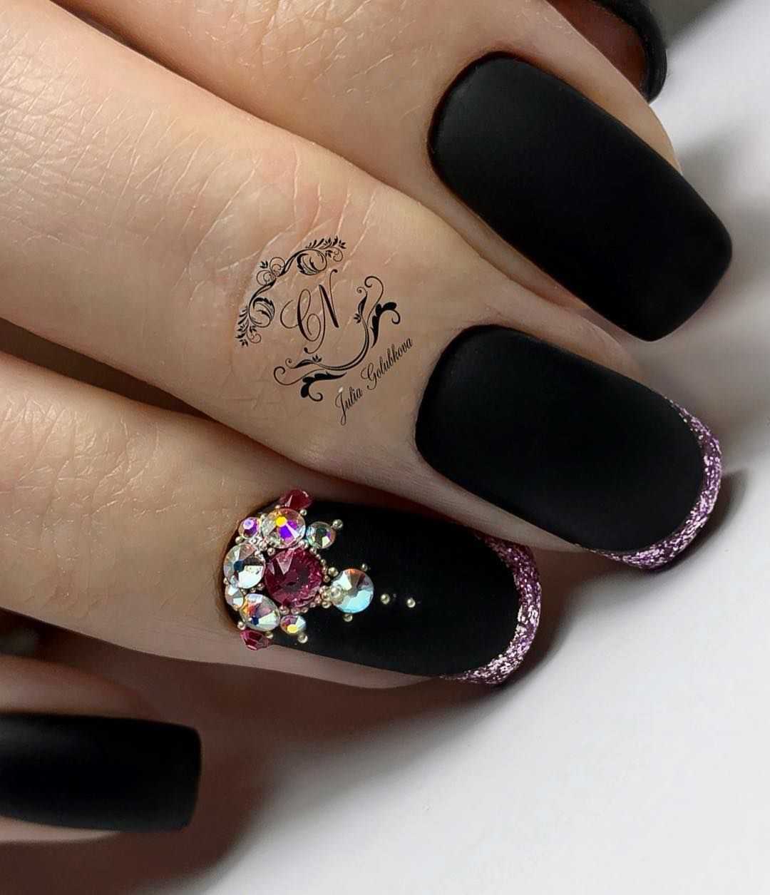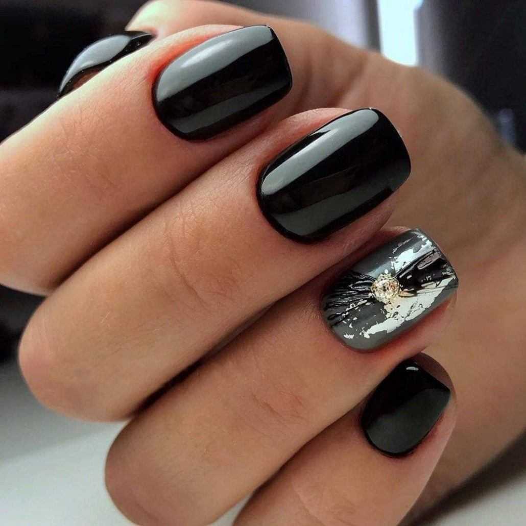 Черный цвет сам по себе является украшением ноготков, но незначительный дизайн будет не лишним. С черным цветом сочетают такие узоры как геометрия, флористика, абстракция, серебряные и золотые ленты, выкладка стразами, например, снежинки, кружевные узоры.