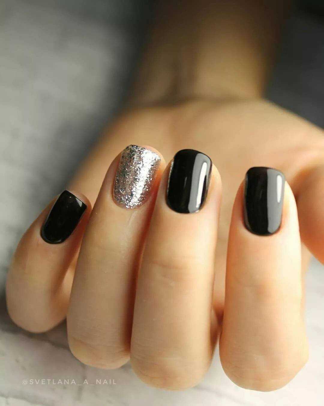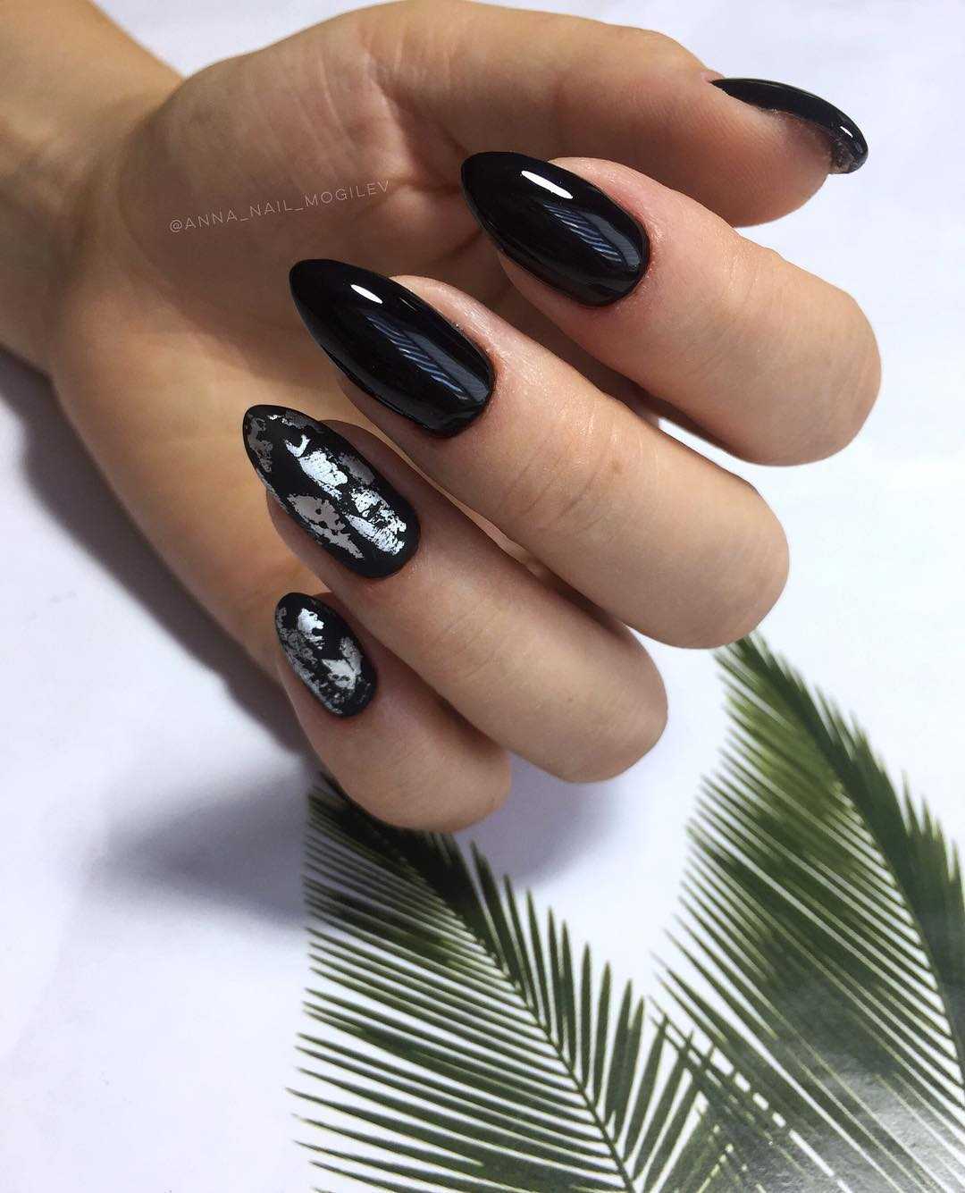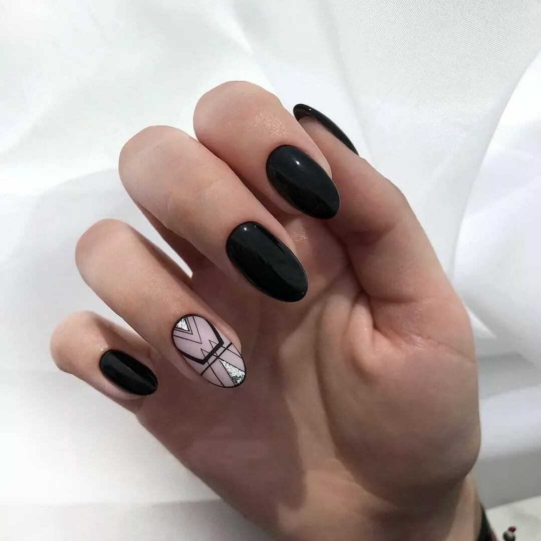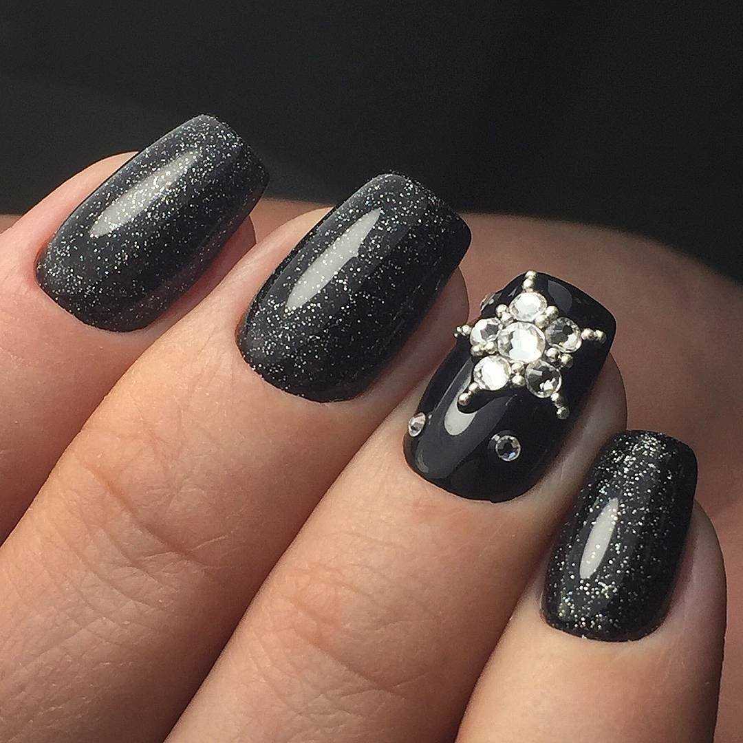 Черный цвет сам по себе является украшением ноготков, но незначительный дизайн будет не лишним. С черным цветом сочетают такие узоры как геометрия, флористика, абстракция, серебряные и золотые ленты, выкладка стразами, например, снежинки, кружевные узоры.