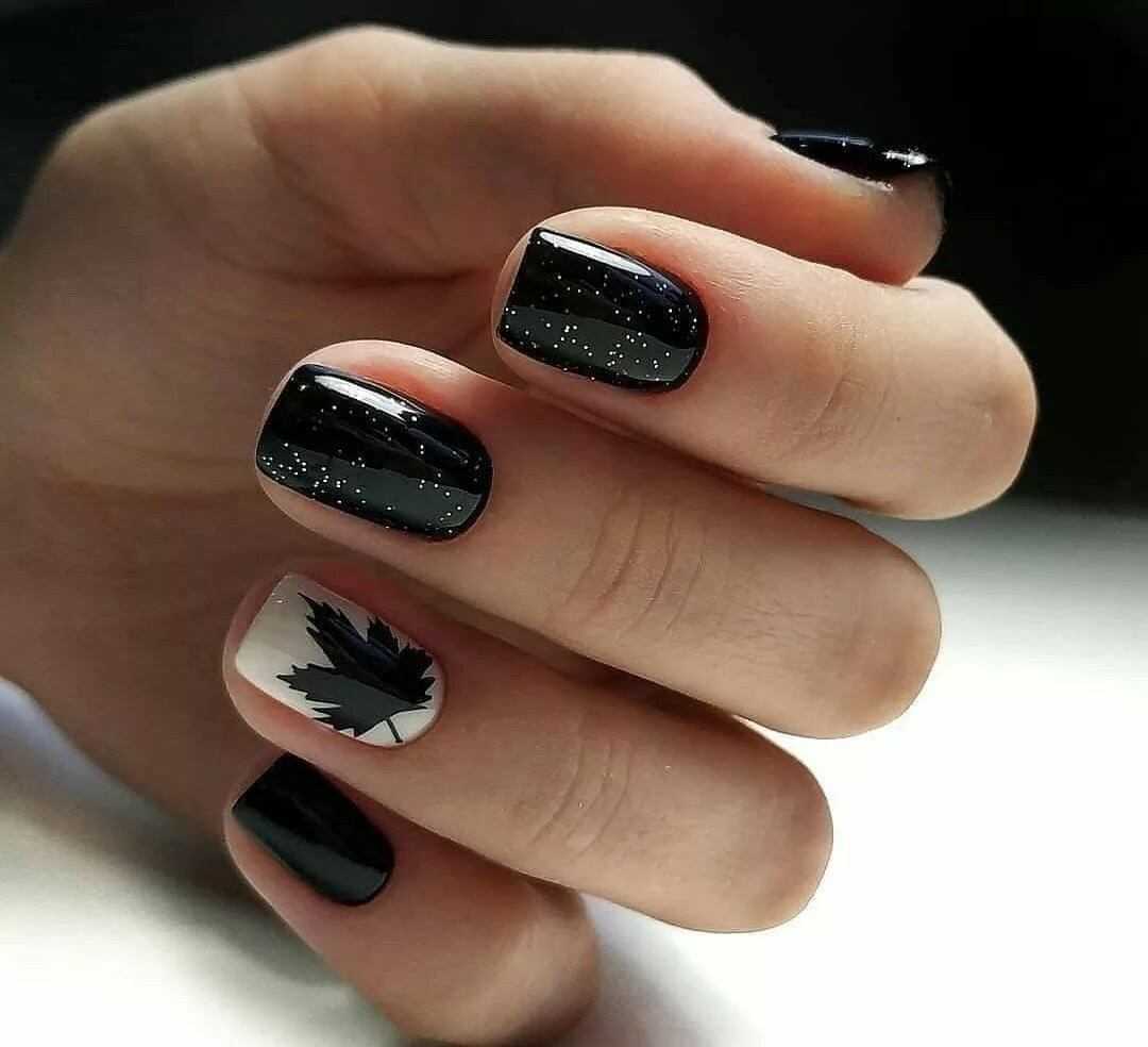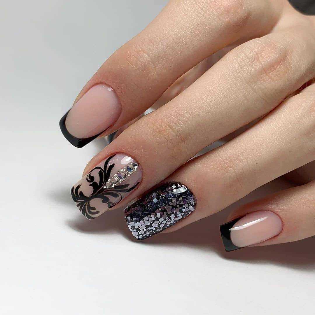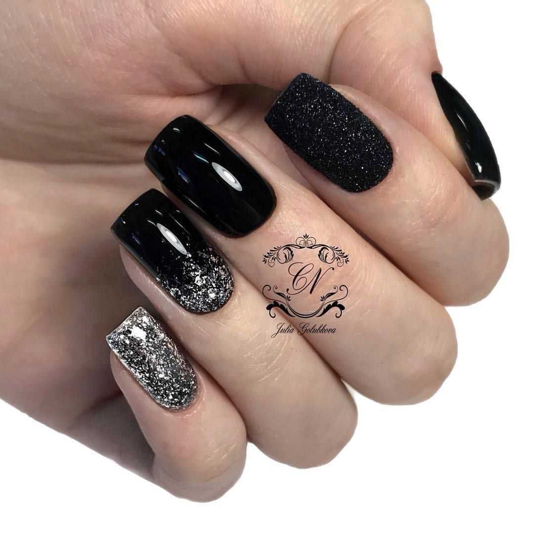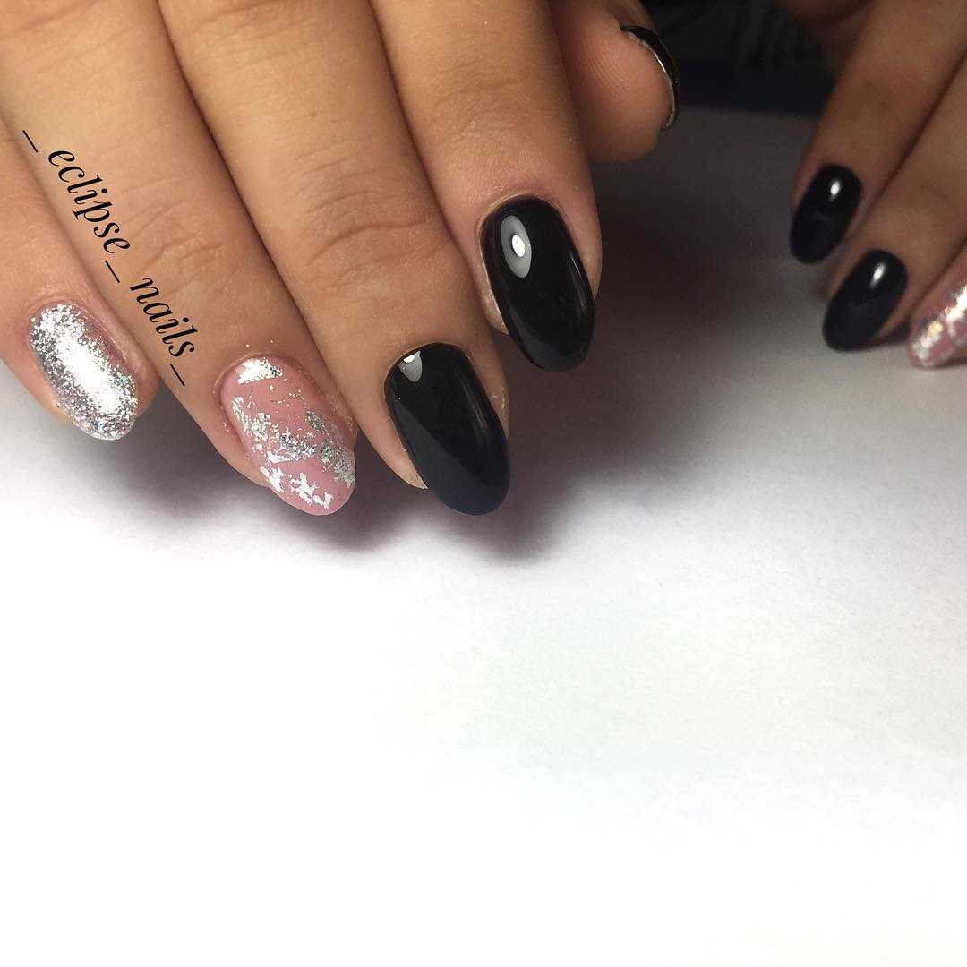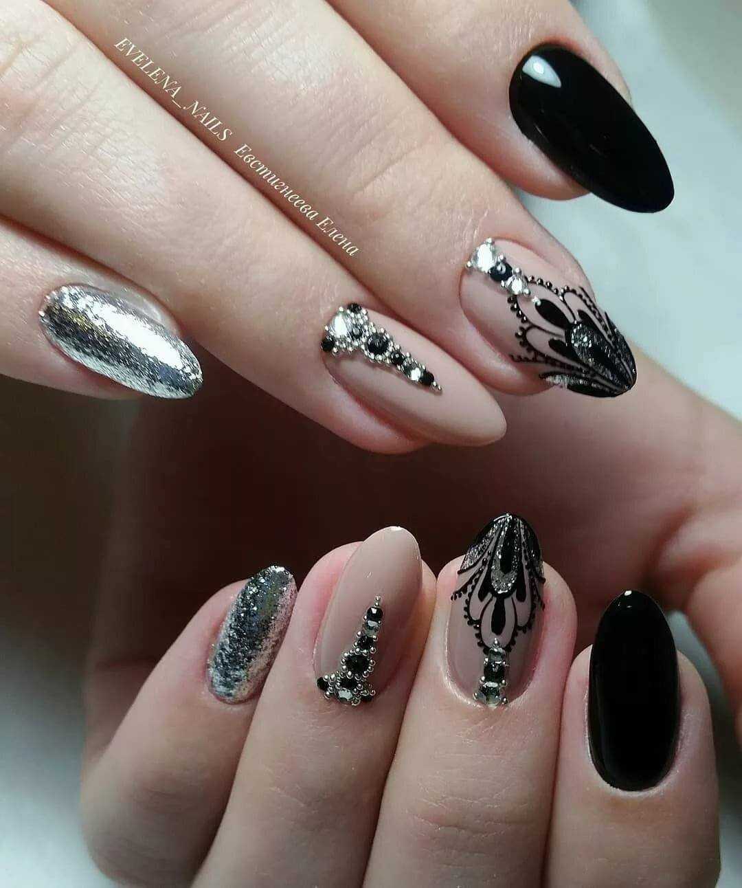 Черный цвет сам по себе является украшением ноготков, но незначительный дизайн будет не лишним. С черным цветом сочетают такие узоры как геометрия, флористика, абстракция, серебряные и золотые ленты, выкладка стразами, например, снежинки, кружевные узоры.