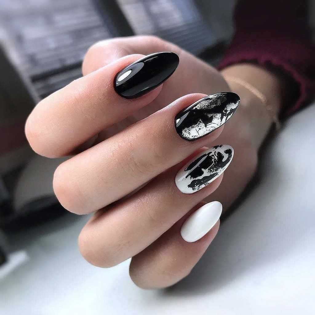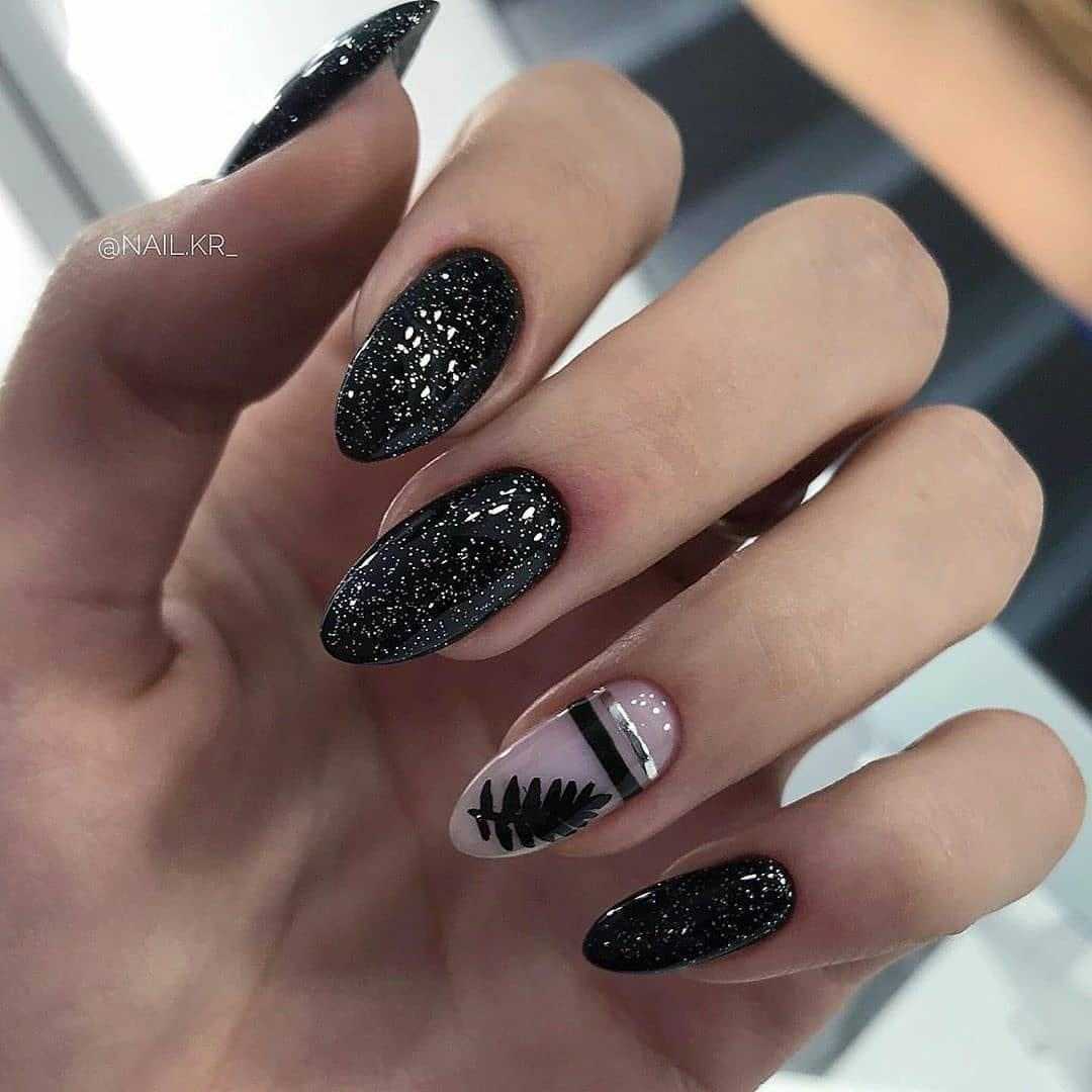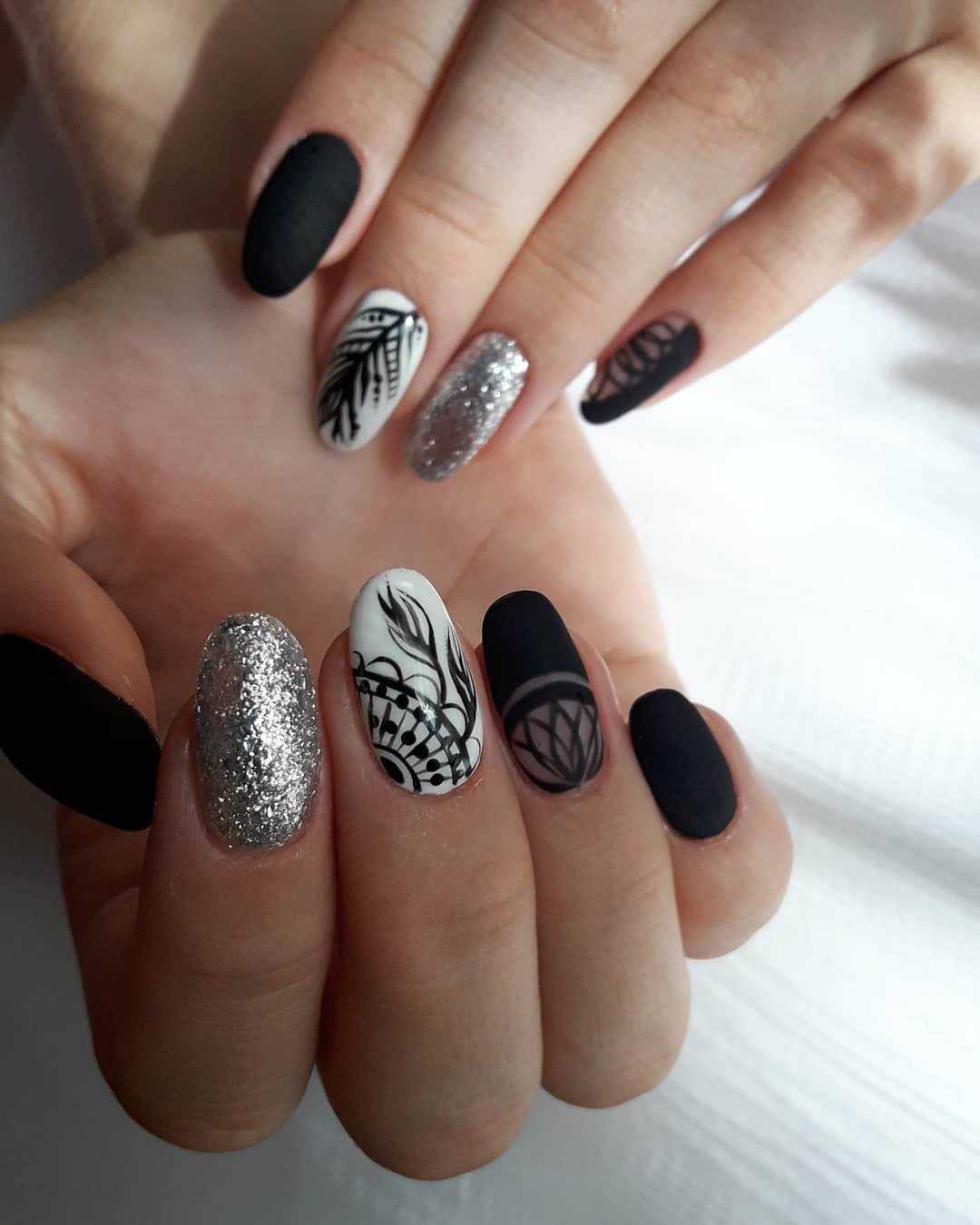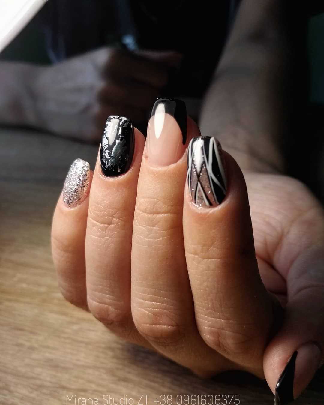 Черный цвет сам по себе является украшением ноготков, но незначительный дизайн будет не лишним. С черным цветом сочетают такие узоры как геометрия, флористика, абстракция, серебряные и золотые ленты, выкладка стразами, например, снежинки, кружевные узоры.