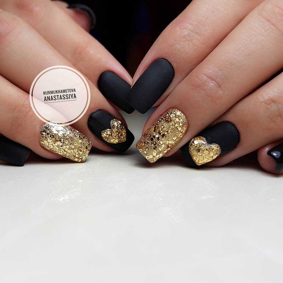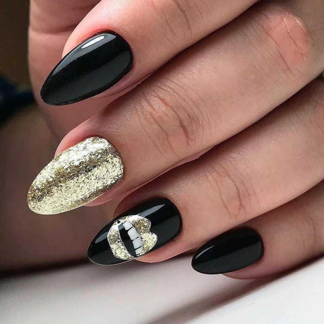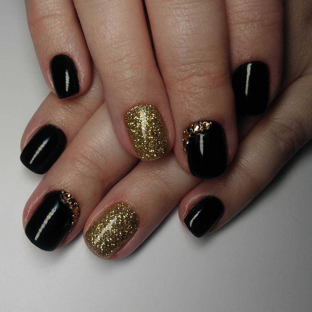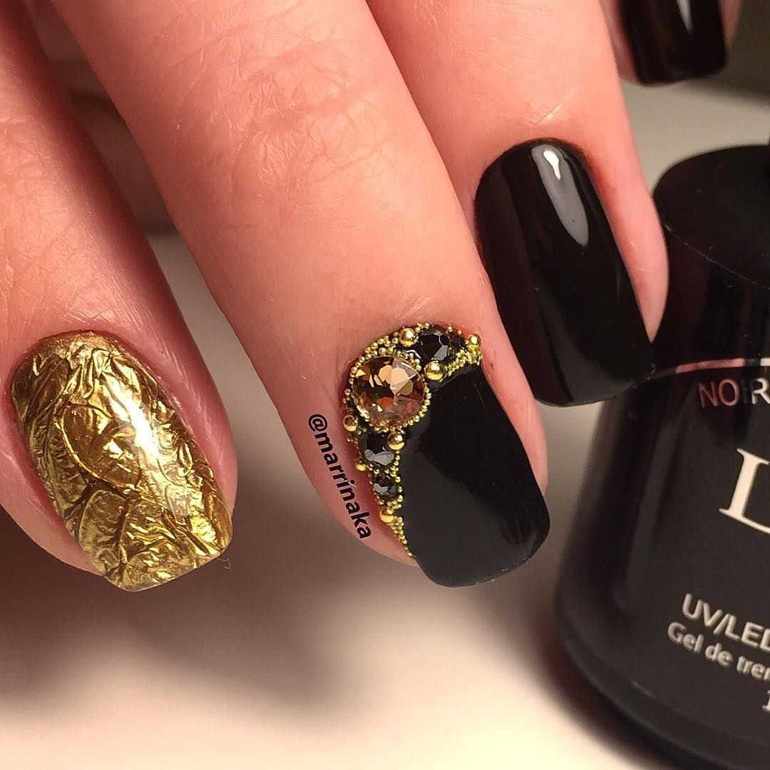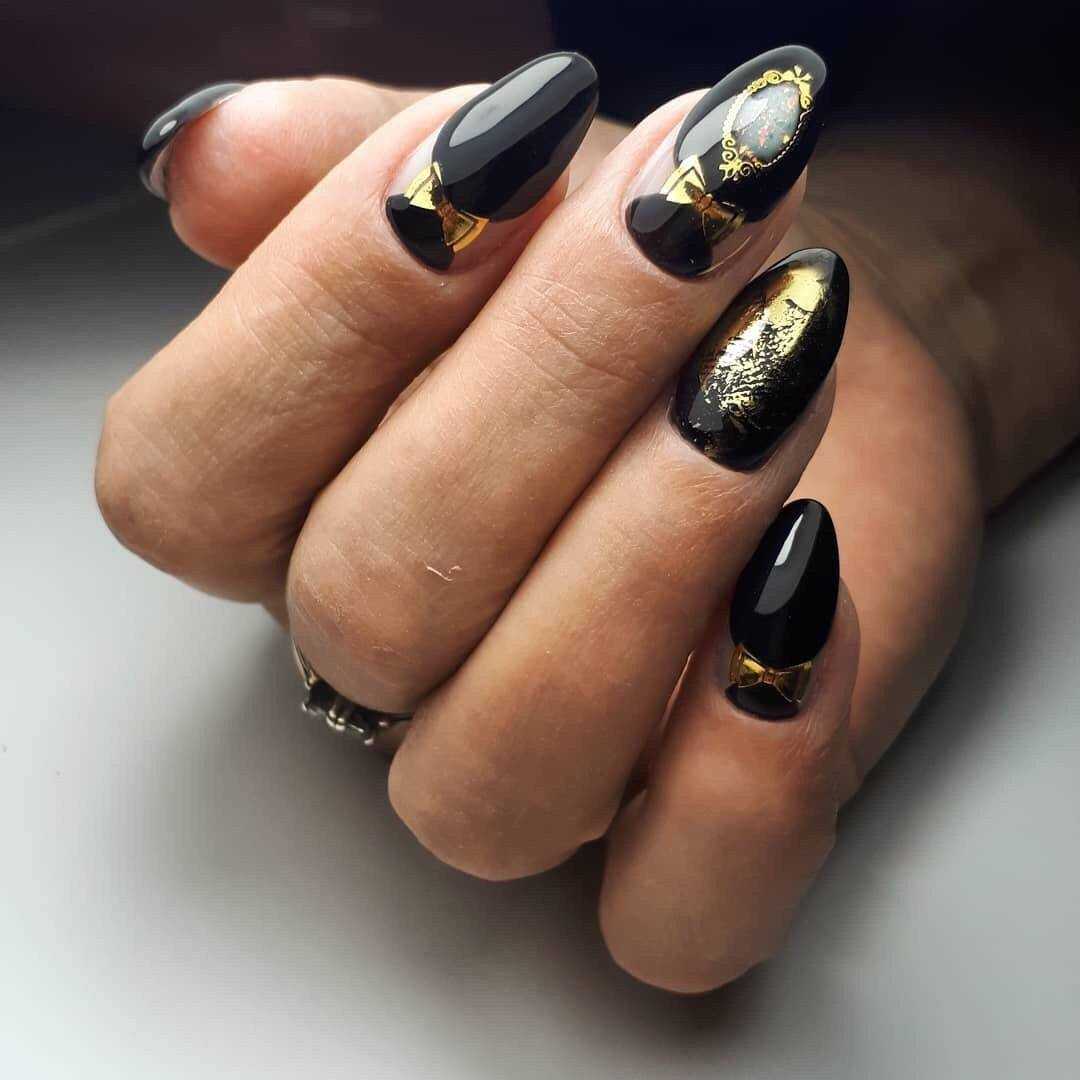 Сочетание черного и золотого цветов выглядит дорого и благородно. Такой маникюр не для повседневной носки, чаще всего он используется в торжественных образах. Дизайн ногтей обязательно должен гармонировать с остальным образом и аксессуарами.