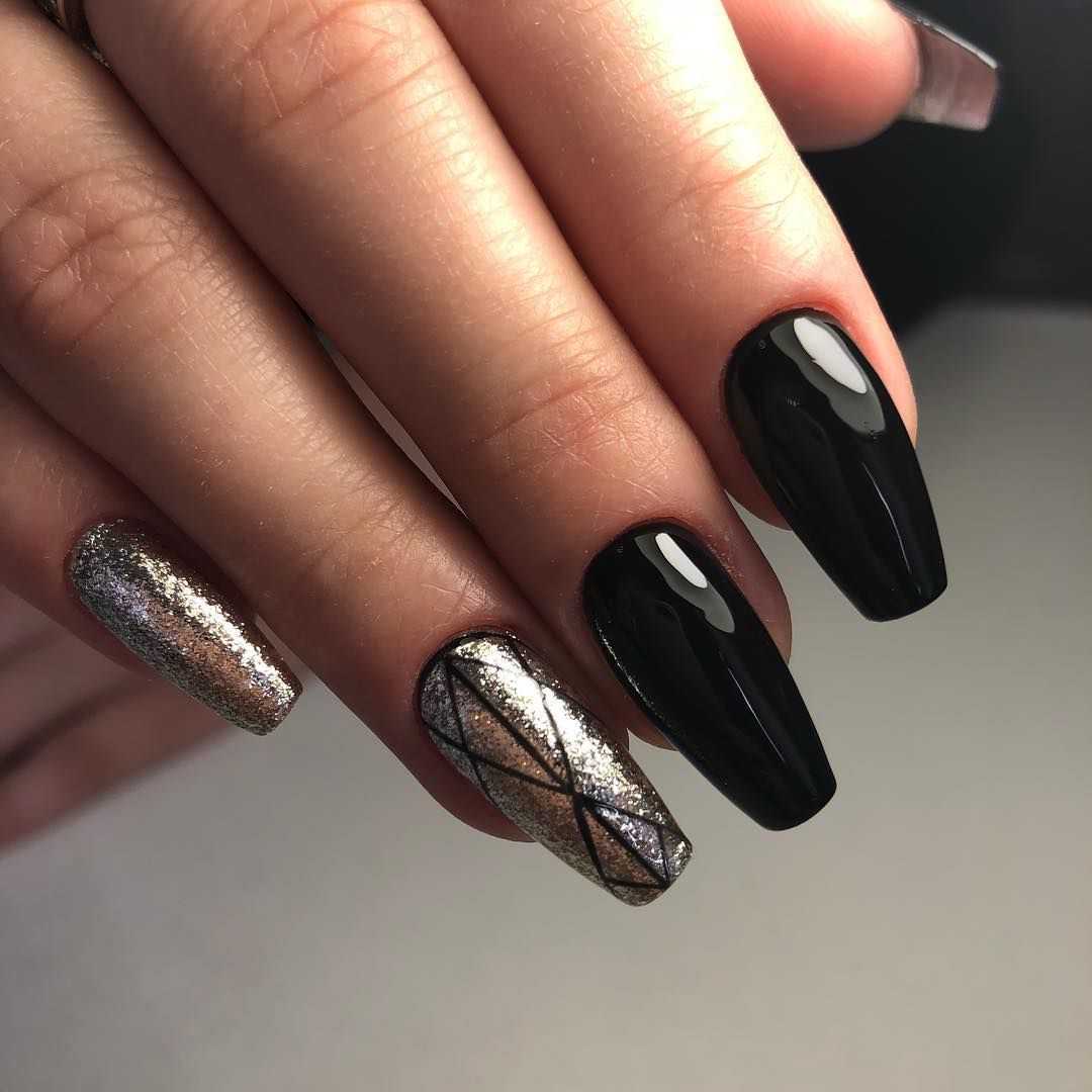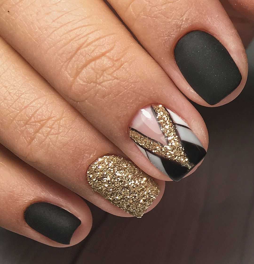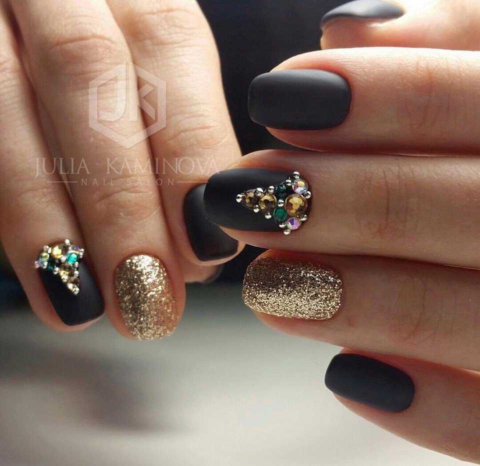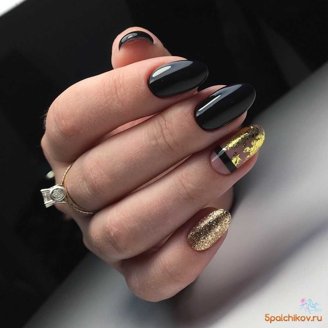 Сочетание черного и золотого цветов выглядит дорого и благородно. Такой маникюр не для повседневной носки, чаще всего он используется в торжественных образах. Дизайн ногтей обязательно должен гармонировать с остальным образом и аксессуарами.