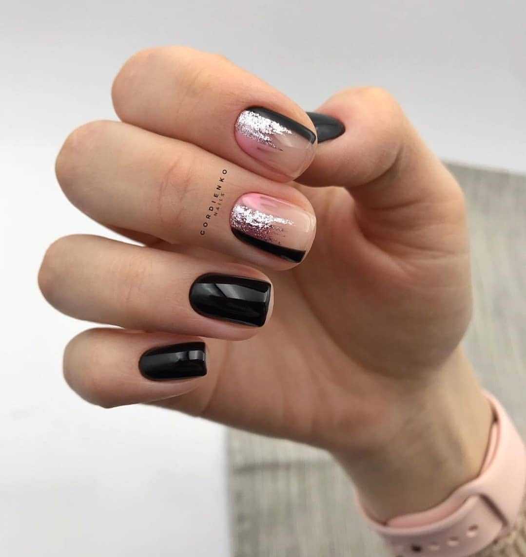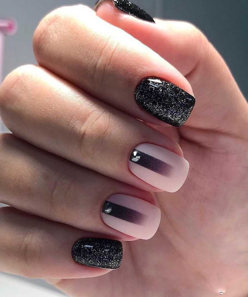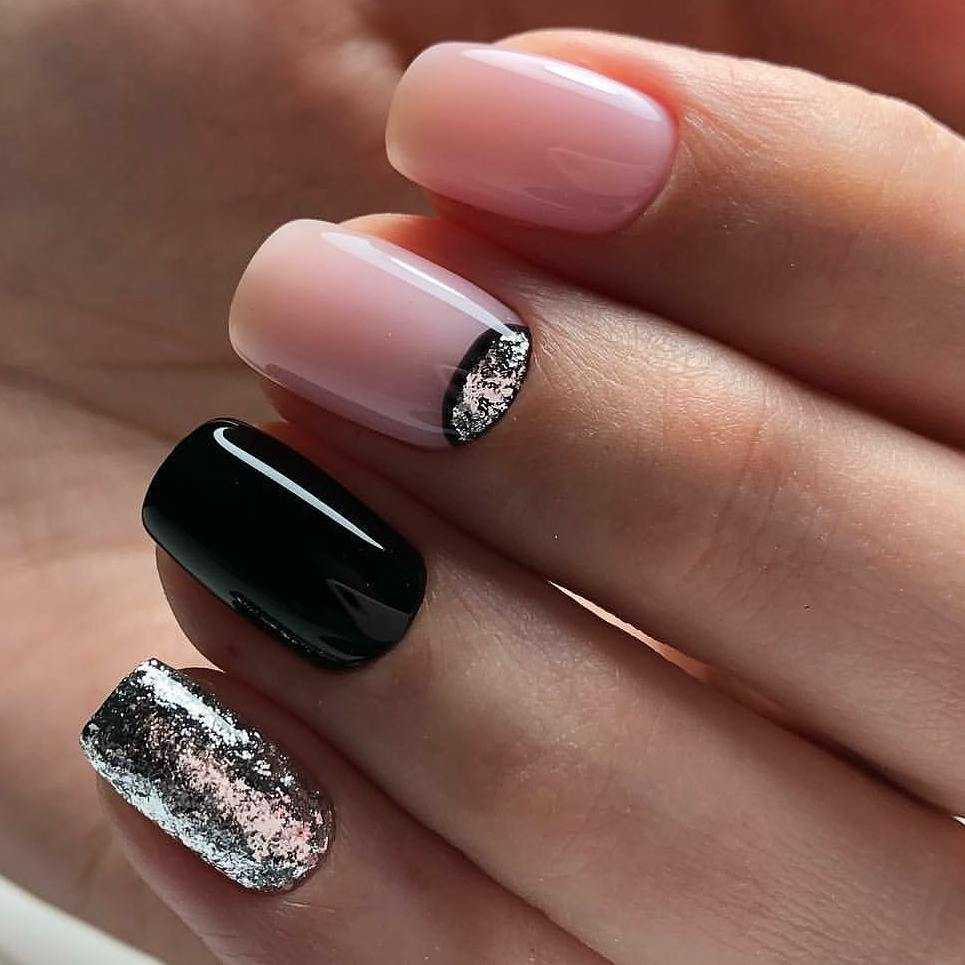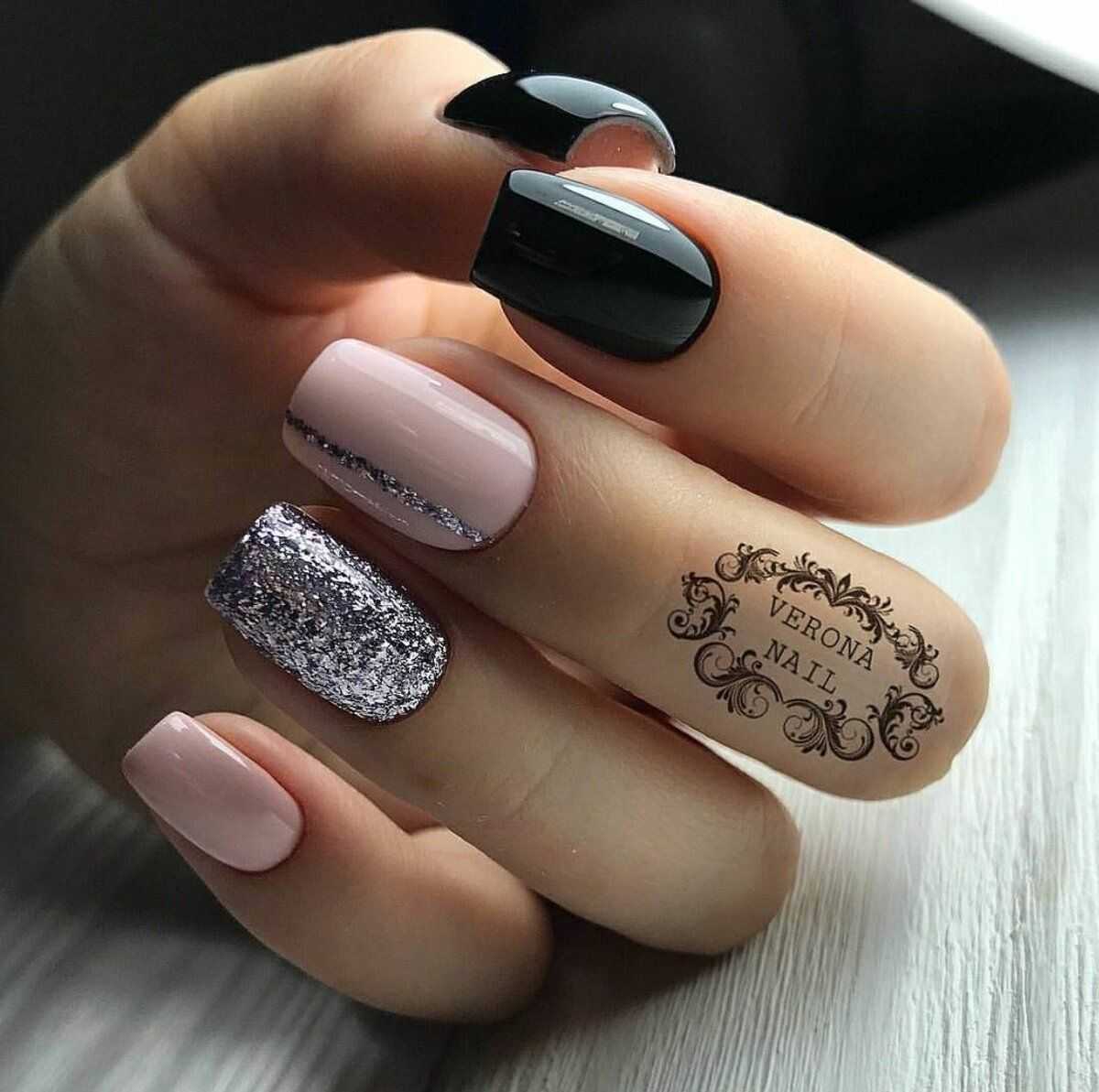 Сочетайте черный цвет с кремовым, бежевым, молочным и другими нейтральными тонами. На светлом фоне можно расположить узоры в черном цвете, например, кружево, сердечки, полоски. На коротких ногтях отлично смотрится сочетание черного и розового цвета. Такой тандем позволяет создать легкий повседневный дизайн с однотонным покрытием и акцентами в виде блесток.