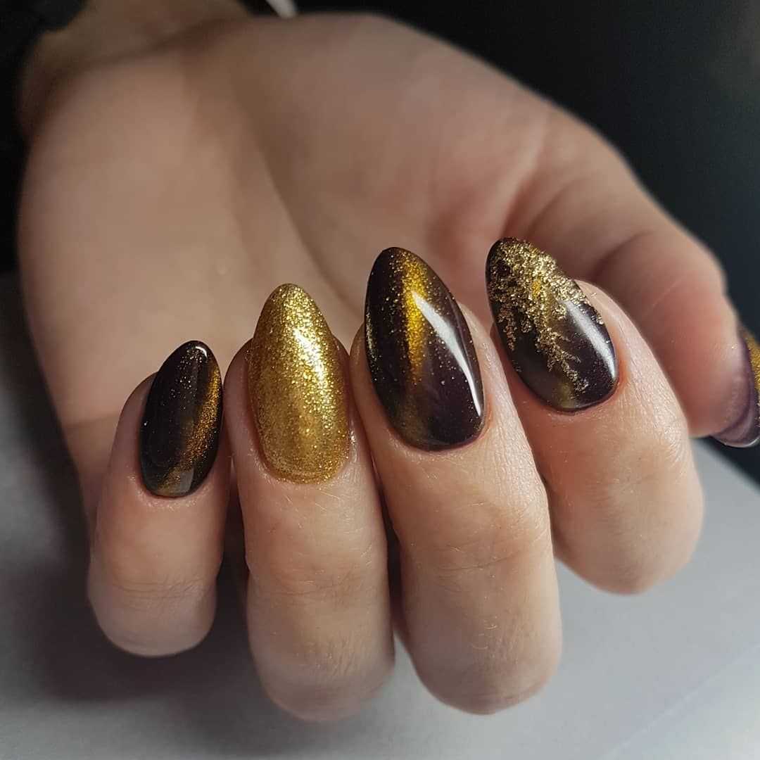 Самый популярный вариант маникюра – это однотонный дизайн с выделением 1-2 ноготков сплошным золотым гель-лаком. Такой дизайн смотрится сдержанно и непринужденно, впишется в образ на вечеринку или корпоратив. Также популярен градиентный дизайн с золотыми блестками, лунный маникюр с треугольными лунками, маникюр “кошачий” глаз.